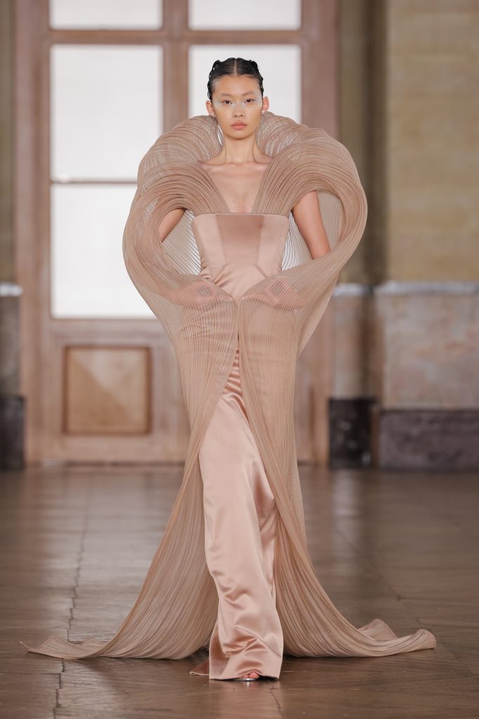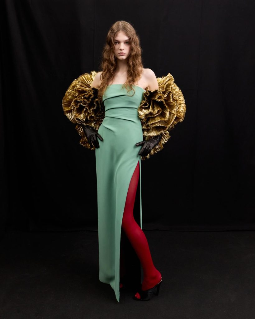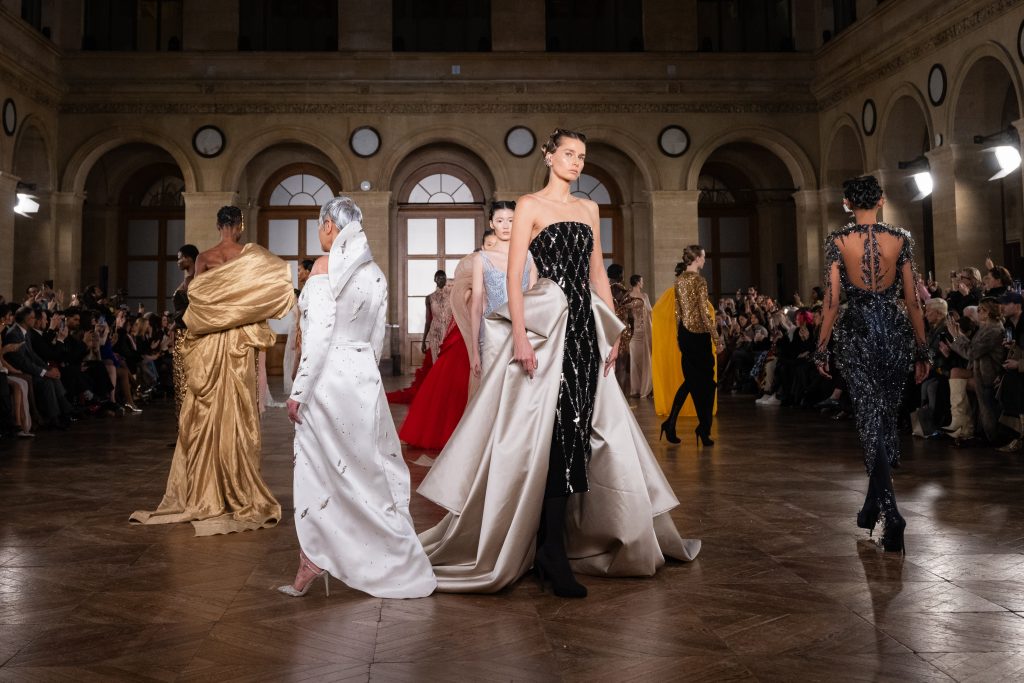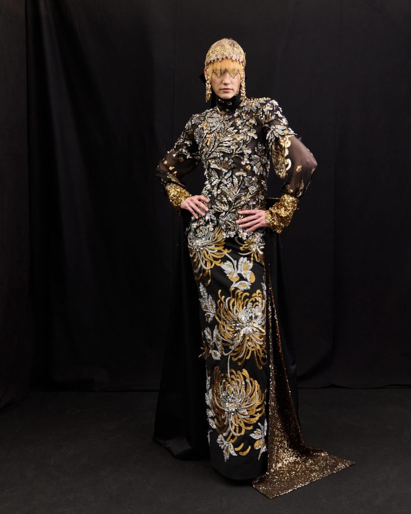 Ashi Studio continued refining its dark romanticism and architectural precision through hues. Sculpted corsetry, exaggerated shoulders and dramatic train lengths constructed commanding silhouettes. High-density tulles and metallic embroidery delivered futuristic ritualism, making this collection ideal for red carpets and performance stages.