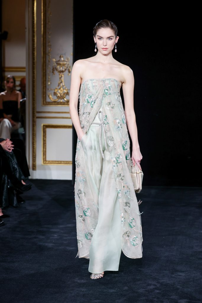 Jade green, mint, champagne gold and misty blush all formed a tranquil palette. Flowing lines and restrained structures embodied effortless elegance. Organza, silk chiffon and delicate sequins created weightless draping and emphasising comfort. The finale featured a bridal gown originally designed by Giorgio Armani himself, a deeply moving tribute to the founder’s legacy.
