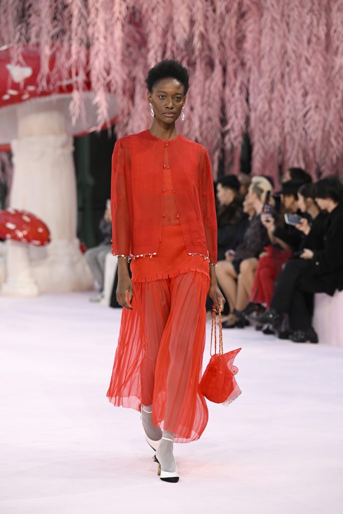 Matthieu Blazy’s first haute couture collection for Chanel turned the Grand Palais into an enchanted forest of pink mushrooms and cascading willows, embodying the house’s devotion to freedom, childlike wonder and poetic escapism. A dreamlike palette blended seamlessly with organza, chiffon, feather embroidery and ultra-light tulles. The highlight accessory was a classic Chanel flap bag rendered entirely in organza, a striking testament to craftsmanship and imagination. Tailoring, gowns and bridal looks floated with weightless grace, blurring the boundary between formality and romance.