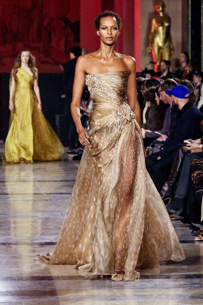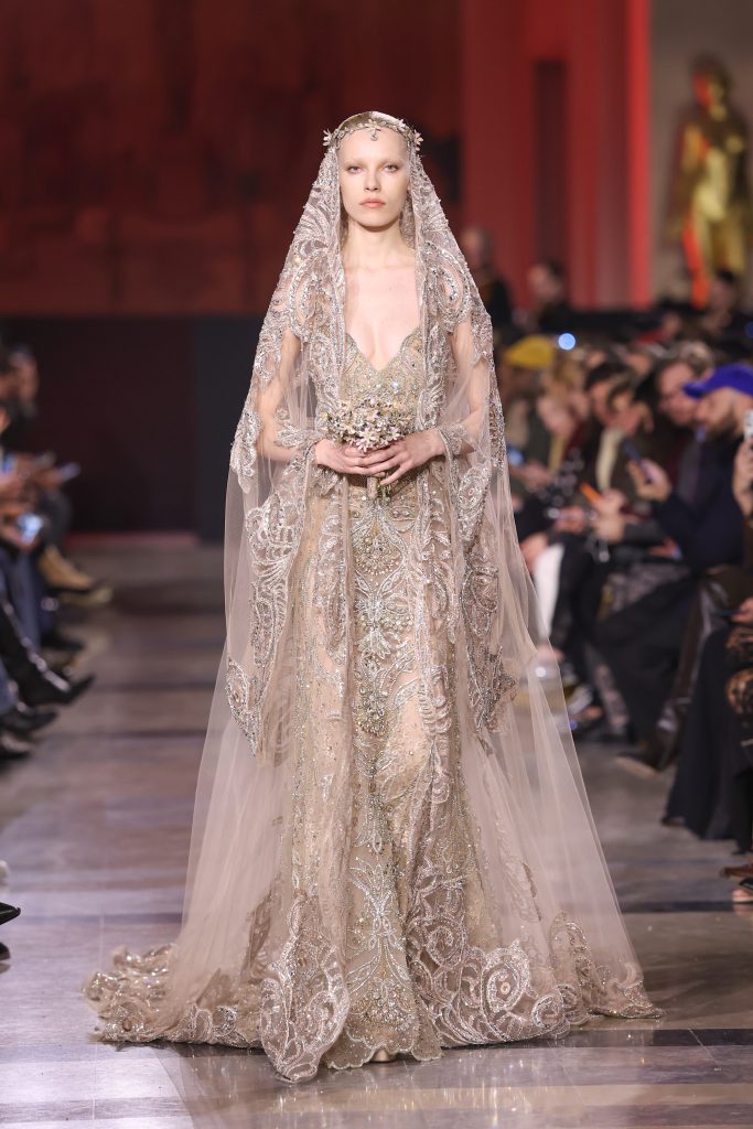 Elie Saab continued his signature romantic couture narrative with gold palette. Sequins, lace and intricate embroidery layered delicately to sculpt ultra-feminine silhouettes. Rather than radical experimentation, the collection embraced stability and refinement, delivering timeless elegance and enduring beauty.