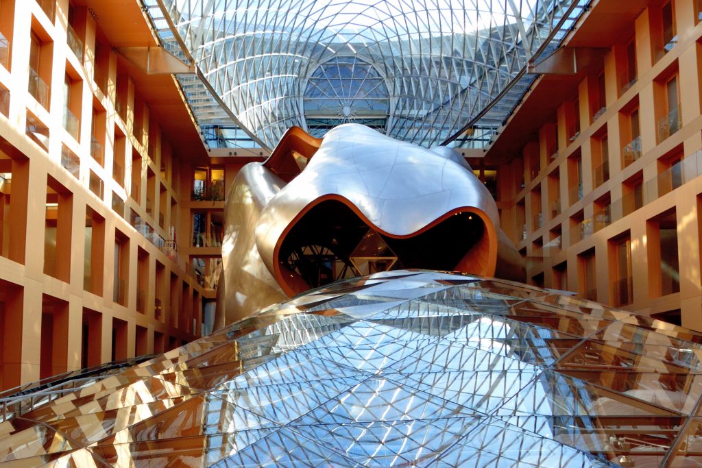 A stone’s throw from the Brandenburg Gate, DZ’s stone facade aligns seamlessly with its blocky neighbors on Pariser Platz, providing little hint of its shocking interior. While Gehry might’ve been known for his eye-catching exteriors, the DZ Bank proves it’s what’s on the inside that counts. A stone’s throw from the Brandenburg Gate, the building has a limestone façade that aligns seamlessly with its blocky neighbors on Pariser Platz. However, when you step inside, you’ll be confronted with a curved stainless steel conference hall, clad with a riot of warm wood panels that has often been compared to a horse’s head. Locals nicknamed the split-personality building the “Whale at the Brandenburg Gate.”