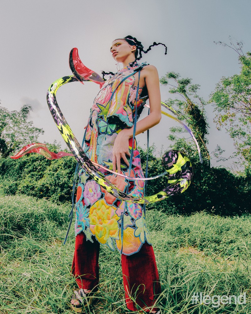 Leaf Xia multicolour floral patchwork dress and red velvet trousers, Simone Rocha raffia platform sandals with pearls and Gucci geometric earring