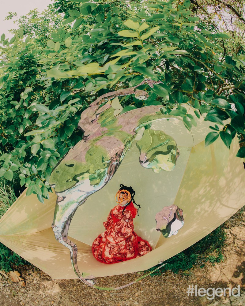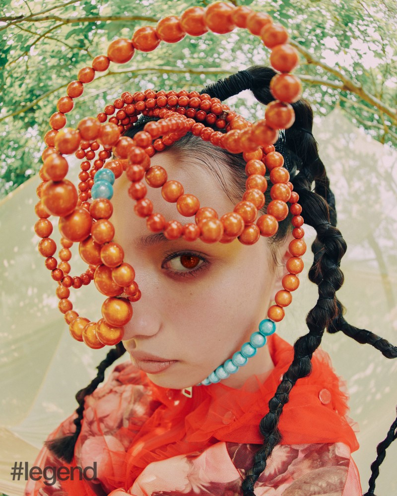 Model in 4 Moncler Simone Rocha red printed jacket with tulle, bra top and dress and Shuting Qiu orange and blue beaded headpiece -