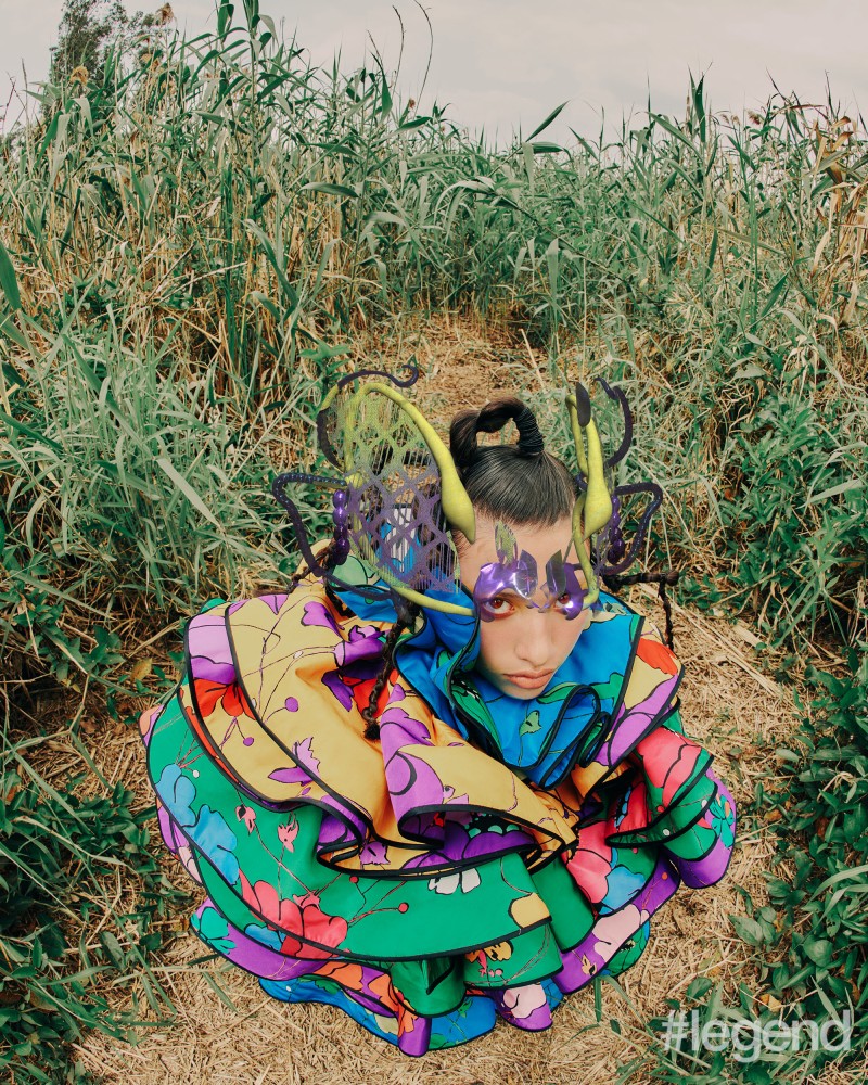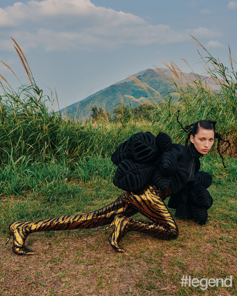 Model in Angus Tsui black sculptural jacket and Balenciaga gold and black sequinned tiger-patterned boot leggings