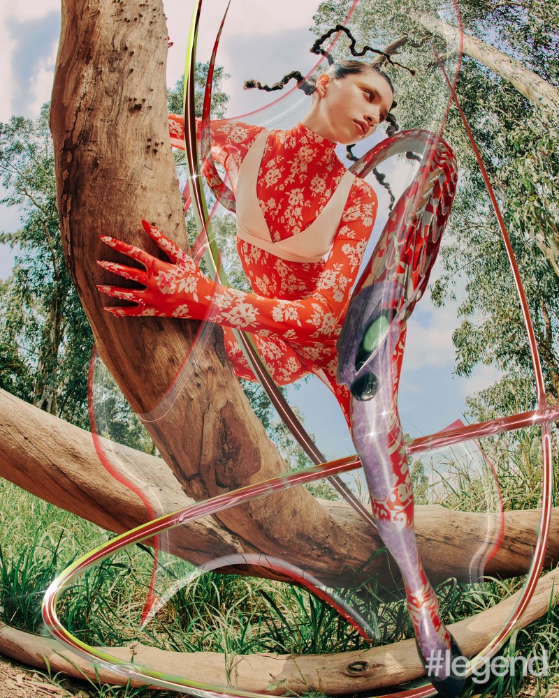 Model in Shuting Qiu red and white printed bodysuit and Givenchy nude leather bra top
