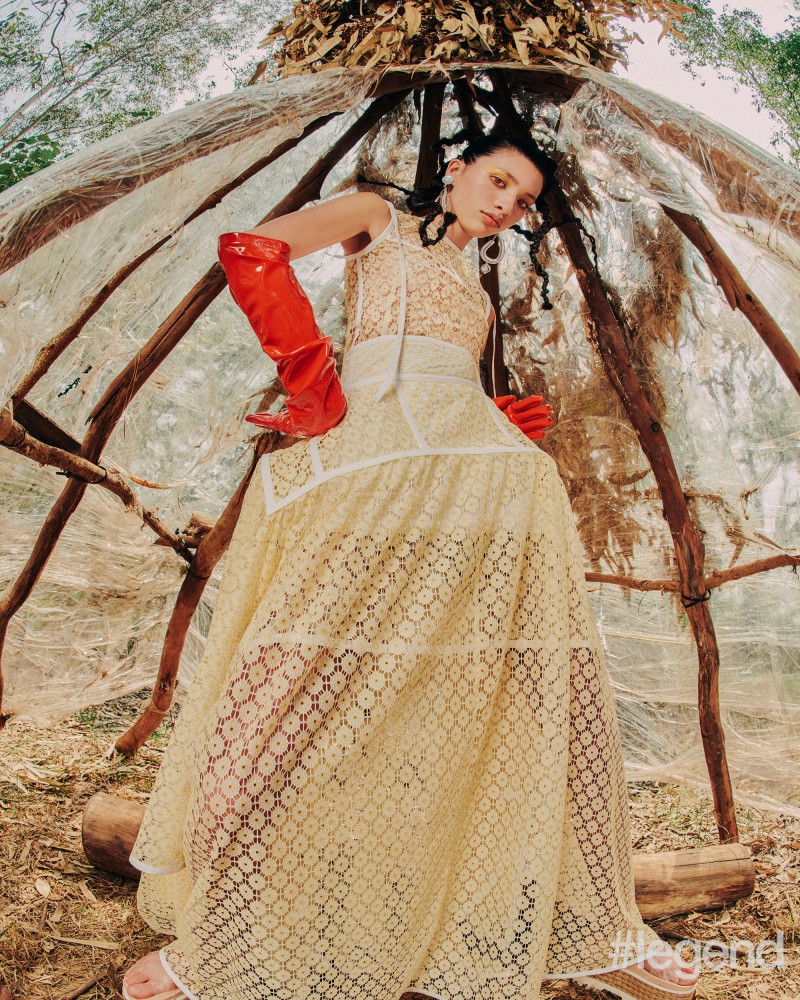 Model in Loewe yellow lace top, belt and dress with white trimming, Simone Rocha raffia platform sandals, Gucci red gloves and Giorgio Armani transparent tube earrings -