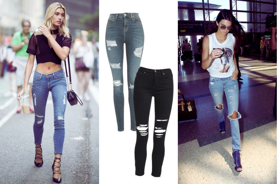 กางเกงยีนส์ทรงสกินนี่คือหัวใจของการแต่งตัวในปี 2016 โดยเฉพาะแบบ Distressed ที่มีรอยขาดบริเวณหัวเข่า ยิ่งขาด ยิ่งเท่ ยีนส์ทรงนี้ถูกออกแบบมาเพื่อเน้นสัดส่วนและช่วยให้ลุคดูเพรียวบาง มักถูกจับคู่กับรองเท้าบูทส้นสูงหัวแหลม หรือสนีกเกอร์พื้นหนา เป็นไอเท็มที่เข้ากันได้กับทุกสถานการณ์ ตั้งแต่ลุคสบายๆในชีวิตประจำวัน ไปจนถึงลุคออกไปปาร์ตี้ตอนกลางคืน