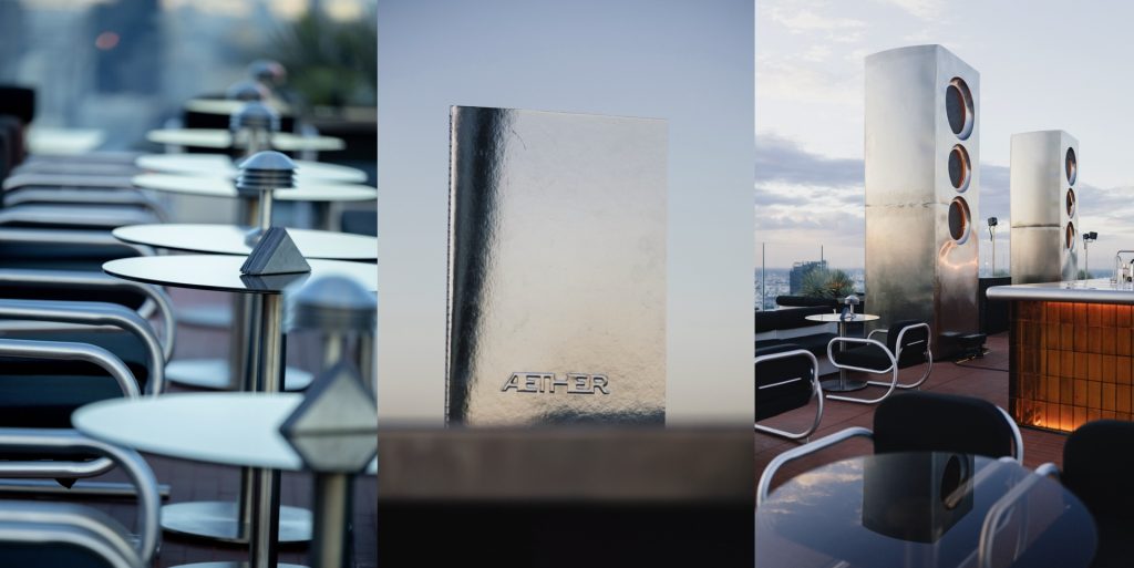 เมื่อพูดถึงกันเรื่องราวของการออกแบบแล้ว ÆTHER นั้นถูกออกแบบมาให้เป็นส่วนหนึ่งของเส้นขอบฟ้าย่านสีลม ด้วยองค์ประกอบที่โดดเด่นตั้งแต่ลำโพงสีเงินขนาดใหญ่ที่ตั้งตระหง่านรับแสงอาทิตย์ เฟอร์นิเจอร์มากอัตลักษณ์แต่แฝงด้วยความสบายอย่างลึกซึ้ง ไปจนถึงการออกแบบแสงที่เปลี่ยนท้องฟ้ายามค่ำคืนให้มีมิติและอารมณ์ที่แตกต่างในแต่ละช่วงเวลา