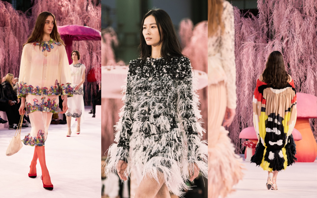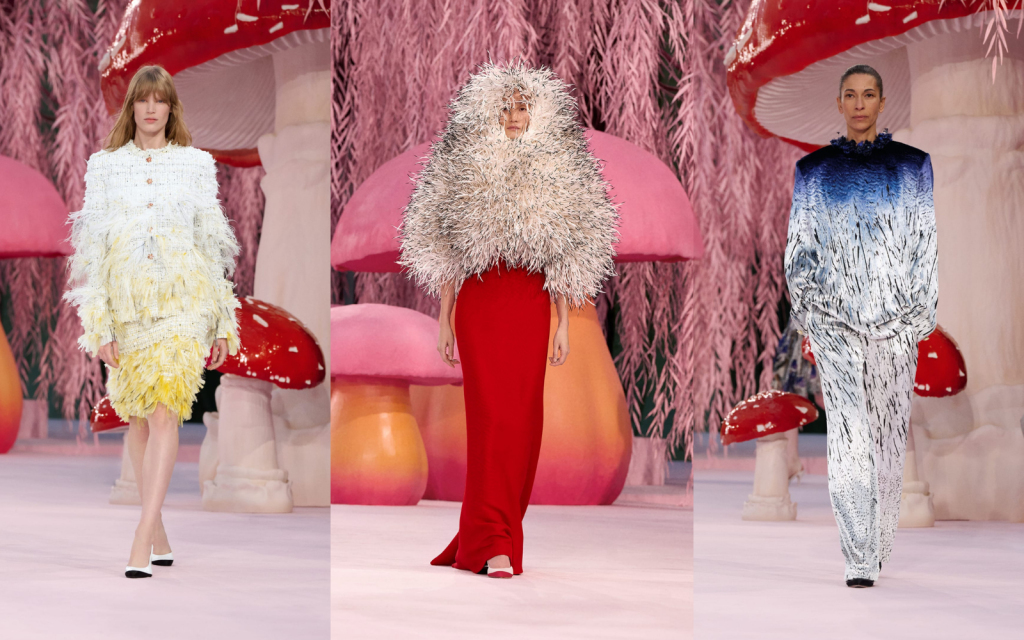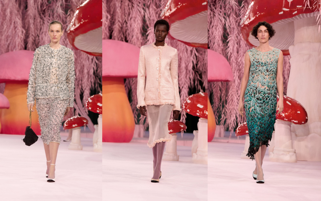 ฉากโชว์สีชมพูอ่อนใน Grand Palais ที่เต็มไปด้วยเห็ด toadstool ขนาดยักษ์และต้น weeping willow สีพาสเทล จึงไม่ได้ถูกออกแบบมาเพื่อความอลังการ แต่เพื่อสร้าง “ภูมิอารมณ์” ของคอลเลกชัน โลกที่เบา นุ่ม ละมุน และปลอดภัยพอให้ความหมายค่อย ๆ ปรากฏขึ้นเอง ความเป็น “Wonderland” แบบ psychedelic ที่เต็มไปด้วย mycelia เห็ดเหมือนวงแหวนเวทมนตร์นั้นไม่ใช่เพียงฉากหลัง แต่เป็นการประกาศว่า Chanel ในมือของ Blazy กำลังย้ายจุดศูนย์ถ่วงของตัวเองจาก “การแสดง” ไปสู่ “ความฝัน” จาก “ภาพลักษณ์” ไปสู่ “บทกวี” และจาก “ความยิ่งใหญ่” ไปสู่ “การพักหายใจ” ความรู้สึกนี้ถูก tease ตั้งแต่แอนิเมชันเปิดโชว์ที่เป็นสัตว์ป่าทำงานใน atelier ของ Chanel แบบ Cinderella style ซึ่งไม่ได้เป็นลูกเล่นภาพน่ารัก หากแต่เป็นการเล่าโครงสร้างความคิดของ Blazy อย่างชัดเจนว่า Haute Couture คือโลกของแรงงานฝีมือ (petites mains) เวลา ความอดทน และความรักในกระบวนการ ไม่ใช่โรงงานผลิตภาพลักษณ์ “ผมอยากได้อะไรที่เบา เป็นบทกวี และเข้าใจง่าย การทำให้มันเบา ยังช่วยลดดราม่าลงด้วย” ประโยคนี้ไม่ใช่คำโปรย แต่คือ manifesto ของยุค Chanel ใหม่ การทำให้เบาไม่ได้หมายถึงความตื้น แต่คือการลดเสียงรบกวน ลดแรงกดดัน และลดภาระของความคาดหวังที่ทับซ้อนแบรนด์มาหลายทศวรรษ