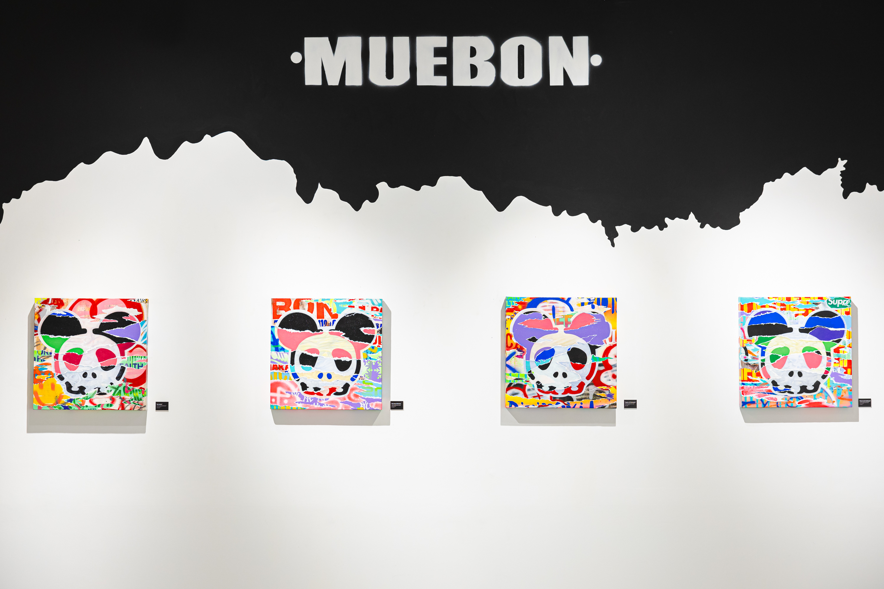 ในส่วนของ Muebon ที่เปลี่ยนสัญลักษณ์ของทุนนิยมให้กลายเป็นสตรีทอาร์ตที่เต็มไปด้วยสีสันสดใส สะท้อนความเป็นเมืองและสังคม รวมถึงแรงบันดาลใจที่เขาได้รับจากนิวยอร์กซิตี้ โดยผลงานชิ้นใหม่เต็มไปด้วยความน่าสนใจ เนื่องจากผลงานของเขาสะท้อนประสบการณ์การในการใช้ชีวิตในนิวยอร์กซิตี้ ผ่านตัวละครสุคไอคอนิกของเขาอย่าง ‘Mori’ โดยเขาได้ใช้ภาพโฆษณาที่พบเจอในชีวิตประจำวันมาสร้างสรรค์เป็นผลงานศิลปะที่สะท้อนและวิพากษ์สังคมทุนนิยม