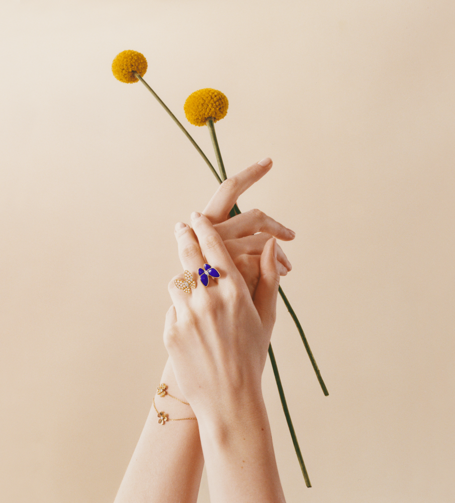 The butterfly form has had a constant presence at Van Cleef & Arpels. They often appear on the dials of the Maison’s timepieces and are the stars of the Two Butterfly collection. Among the most playful interpretation of this fluttering motif is the Two Butterfly Between the Finger ring, where two of these graceful creatures shimmer with the shine of diamonds and sapphires.