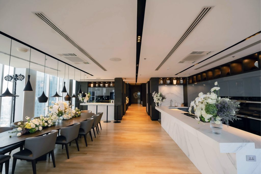 เมื่อบรรยากาศเคลื่อนไปสู่ช่วงค่ำ แขกผู้มีเกียรติได้ขึ้นไปยังเอาท์ดอร์รูฟท็อปของ Miele Lounge เพื่อดื่มด่ำกับวิวเมืองยามค่ำคืน พร้อมสัมผัสขนมหวานที่รังสรรค์โดย École Ducasse Nai Lert Bangkok Studio สถาบันศิลปะการทำอาหารระดับโลกที่สืบทอดปรัชญาและความเป็นเลิศด้านขนมหวานแบบฝรั่งเศส ภายใต้การก่อตั้งของเชฟระดับตำนาน Alain Ducasse ความสมดุลของรสชาติและความงดงามในรายละเอียดของแต่ละชิ้นงาน สะท้อนแนวคิดเดียวกับที่ Miele ยึดถือในเรื่องของความพิถีพิถันที่มองเห็นได้ผ่านประสบการณ์จริง