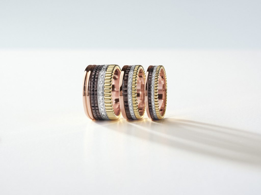 ตั้งแต่ Grosgrain ลวดลายที่ชวนให้นึกถึงผ้าไหมอัดจีบจากโลกโอต์กูตูร์, Double Godron เส้นวงแหวนคู่ที่ได้แรงบันดาลใจจากเสาในยุค 1860s, Clou de Paris ที่จำลองพื้นผิวของถนนปารีสตั้งแต่ปี 1911 และ Line of Diamonds งานฝังเพชรเรียงเส้นตรง ทั้งหมดนี้ถูกถ่ายทอดลงบนแหวน Quatre ครั้งแรกในปี 2004 กลายเป็นภาษาดิไซน์ที่ทั้งร่วมสมัย แข็งแกร่ง ทั้งยังแฝงนัยของการปกป้อง รังสรรค์ด้วยตัวเรือนทอง 18K ในสามเฉดสี และ PVD สีน้ำตาลที่มอบสีสันอันเป็นเอกลักษณ์