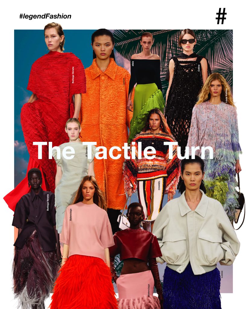 แม้จะเป็นฤดูร้อน แต่เรากลับได้เห็นผ้าที่มีเท็กซ์เจอร์พิเศษในลักษณะคล้ายขนเฟอร์นุ่มฟู ชวนให้เผลออยากเอื้อมมือเข้าไปสัมผัส ตั้งแต่เดรสที่สร้างสรรค์ด้วยแถบผ้าชายรุ่ยซ้อนทับกันของ Bottega Veneta ไปจนถึงกระโปรงชายพู่ที่ร้อยเรียงด้วยลูกปัดสีน้ำเงินจาก Loewe ที่ยิ่งดูสะดุดตาขึ้นทุกครั้งเมื่อเคลื่อนไหว