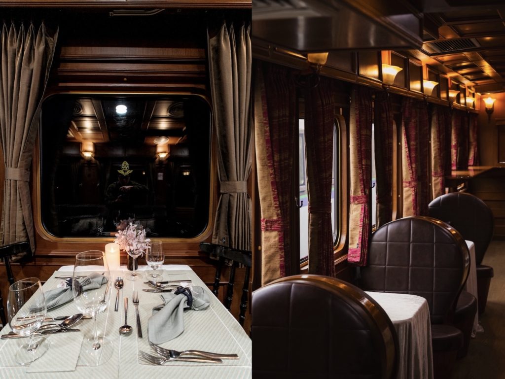 ภายในขบวนรถไฟ ทั้ง 10 ตู้โดยสารได้ถูกเนรมิตด้วยไอเทมตกแต่งจาก Jim Thompson กว่า 2,000 ชิ้น ทุกพื้นผิว ทุกลวดลาย และทุกเฉดสี ล้วนสะท้อนความประณีตของงานหัตถศิลป์ไทย ตั้งแต่ผ้าไหมที่ใช้ในห้องพักส่วนตัว ห้องอาหาร ไปจนถึงโซนชมวิว ซึ่งเปิดพื้นที่ให้สายตาได้ทอดยาวออกไปสู่เมืองมรดกโลกอย่างอยุธยา สุโขทัย อุทัยธานี และเชียงใหม่ ราวกับการอ่านบทกวีที่เปิดเผยความหมายทีละบท
