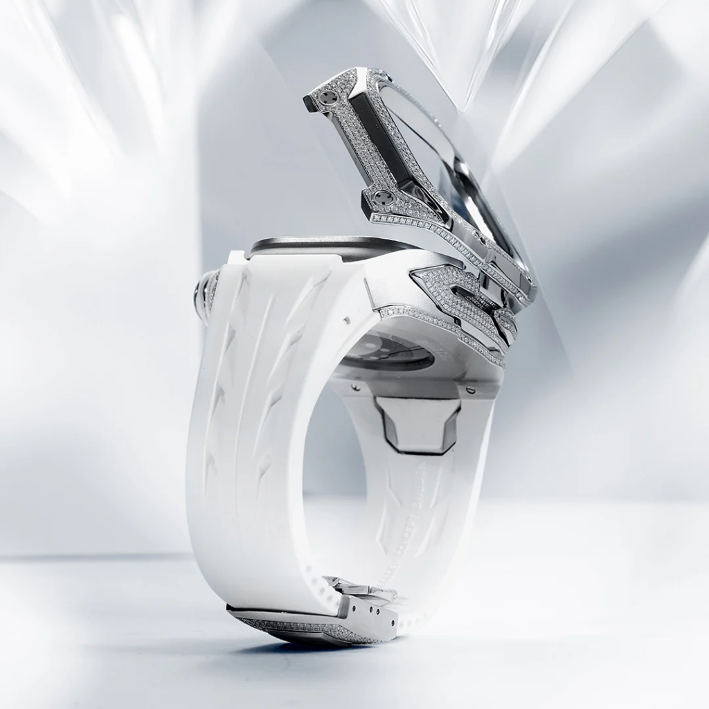 แบรนด์ลักชัวรีจากสวีเดน Golden Concept ยังคงตอกย้ำความเชี่ยวชาญในการยกระดับผลิตภัณฑ์ของ Apple ให้ก้าวข้ามขีดจำกัดของเทคโนโลยีสู่โลกแห่งไฟน์จิวเวลรี เคสสำหรับ Apple Watch รุ่น Diamond Edition คือหนึ่งในผลงานที่สะท้อนปรัชญานี้ได้อย่างชัดเจน ตัวเรือนถูกแกะสลักจากไทเทเนียมบล็อกเดียว ก่อนประดับด้วยเพชร VVS มากถึง 1,068 เม็ด น้ำหนักรวม 5.6 กะรัต ถ่ายทอดประกายอันเจิดจรัสในทุกมุมมอง ความล้ำสมัยยังปรากฏผ่านเทคโนโลยี Hatch-Bezel® ที่จดสิทธิบัตร ซึ่งเปลี่ยนประสบการณ์การใช้งานให้เรียบง่ายยิ่งขึ้น เพียงคลิกเดียวก็สามารถยึดตัวเรือนเข้ากับเคสได้อย่างมั่นคง ภายในเสี้ยววินาที รายละเอียดอื่นๆ ถูกออกแบบอย่างพิถีพิถันไม่แพ้กัน ไม่ว่าจะเป็นตัวเชื่อมสายแบบใหม่ที่ผลิตจากสเตนเลสสตีล 316L เพื่อความทนทานสูงสุด หรือสายยางฟลูออโรอีลาสโตเมอร์ที่ให้กลิ่นอายสปอร์ตหรู คล้ายกับ Audemars Piguet Royal Oak Offshore ซึ่งผสานความแข็งแกร่งเข้ากับความหรูหราได้อย่างลงตัว