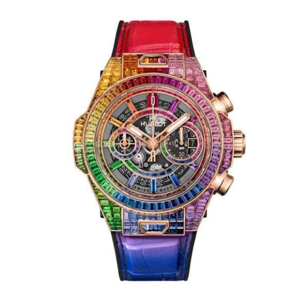 The Big Bang One Click King Gold Rainbow is a statement piece if there was one. A polished 18K King Gold case is set with 48 baguette-cut gemstones, namely rubies, pink sapphires, amethysts, blue sapphires, blue topazes, tsavorites, yellow sapphires and orange sapphires.