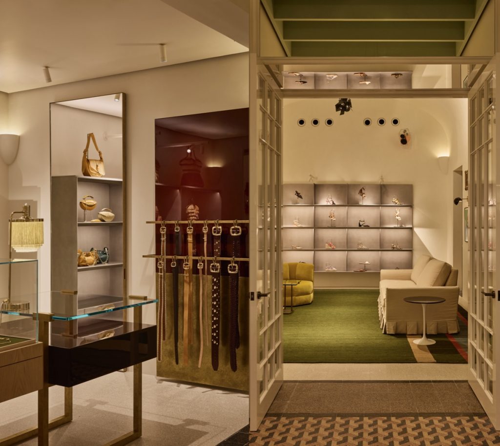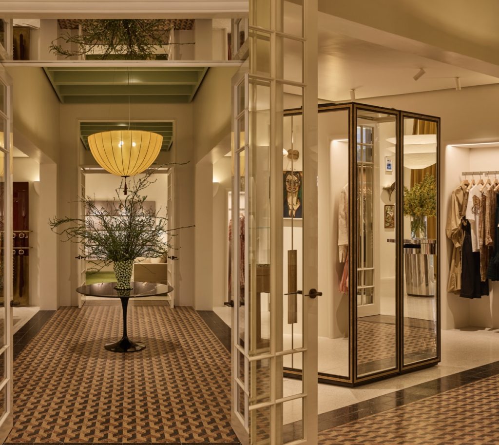 การออกแบบภายในเป็นผลงานของ Studio McQualter สตูดิโอคู่คิดที่ร่วมงานกับแบรนด์มาอย่างยาวนาน โดยนำเสนอการผสมผสานระหว่างศิลปะร่วมสมัยและกลิ่นอายวินเทจอย่างละเมียดละไม ฟาซาดของร้านโดดเด่นด้วยหน้าต่างบานใหญ่ เปิดมุมมองให้เห็นการจัดวางหุ่น เสื้อผ้า และเครื่องประดับ เคียงข้างโต๊ะสไตล์ Dutch Art Deco และชั้นวางสินค้าสไตล์อิตาลียุค 1970s ซึ่งช่วยขับเน้นเสน่ห์ของแบรนด์ให้ดูสง่างามแต่ไม่แข็งกร้าว