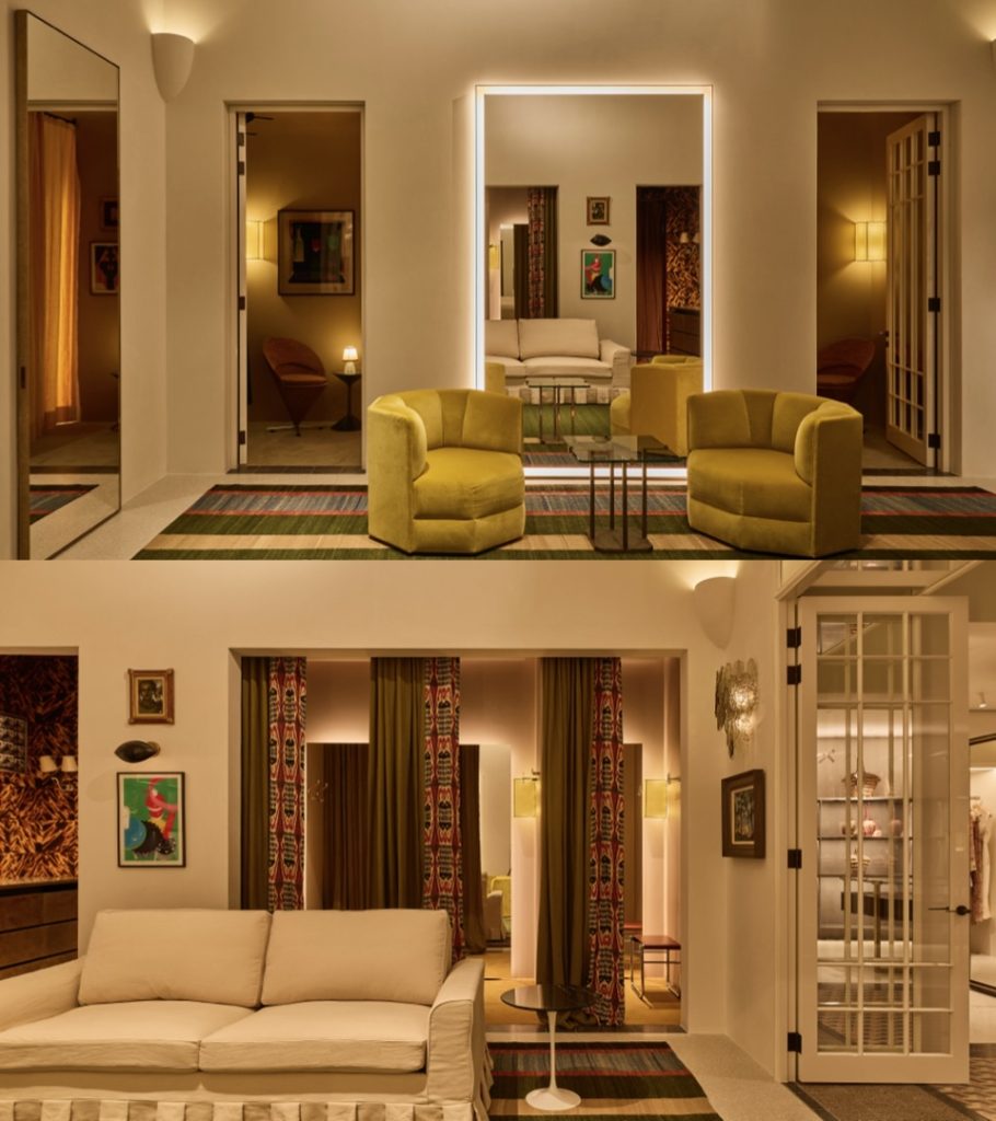 โซนห้องรับรองถูกออกแบบให้เป็นพื้นที่แห่งการพักผ่อนและความเป็นส่วนตัว ผนังสีขาวผิวเรียบไหลลื่นรับกับเพดานโค้งแบบเล่นระดับ เสริมบรรยากาศด้วยไฟ uplighting แสงนุ่ม โซฟา Saratoga วางอยู่บนพรม Kilim ลายทางสั่งทำพิเศษ ขณะที่ห้องลองชุดแต่ละห้องมีรายละเอียดเฉพาะตัว ทั้งวัสดุและผ้าม่านสั่งทำ พร้อมโถงทางเดินที่นำไปสู่ห้องรับรองส่วนตัวสำหรับการนัดหมายพิเศษ มอบประสบการณ์ที่เหนือระดับและเป็นส่วนตัวยิ่งขึ้น