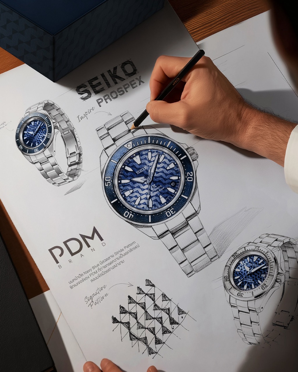 Seiko joins forces with PDM BRAND—the contemporary Thai design house known for elevating the traditional Thai mat into a global design icon-to unveil their first collaborative timepiece: the SEIKO PROSPEX PDM LIMITED EDITION, reference SRPM03K. Blending Japanese precision with a distinctly Thai design sensibility, the watch reinterprets PDM’s signature Stride motif. The geometric pattern, originally woven into the brand’s celebrated mats and created with Finnish textile designer Sini Henttonen, appears on a striking navy blue dial framed by the bold 41.7 mm Samurai stainless steel case. With 200 metre water resistance, the automatic Calibre 4R35, a 41-hour power reserve, and Seiko’s durable Hardlex crystal, the piece unites craft, character and performance.