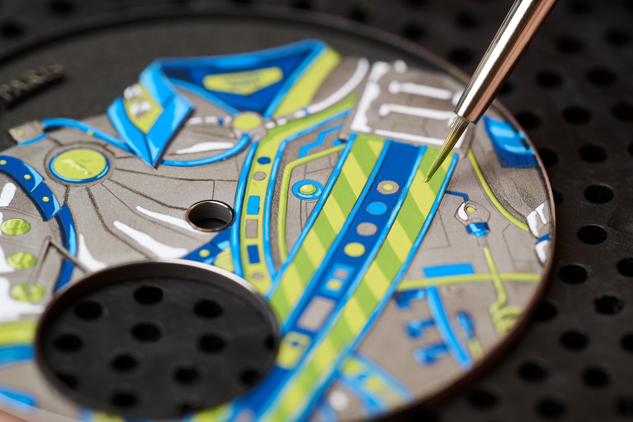 Powered by Hublot’s newly downsized Meca-10 manual-wind movement, the watch reveals its technical refinement through an openworked dial and sapphire caseback. Arsham’s signature Arsham Green accents appear on the hands, numerals and the power-reserve indicator, adding a distinctive artistic touch. Limited to only 99 pieces, the MP-17 is a wearable sculpture that unites fine watchmaking with contemporary art in a visionary and compelling form.