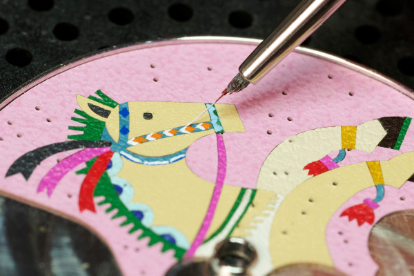 นาฬิกาทรงกลมเรือนสวยโดดเด่นด้วยหูตัวเรือนแบบอสมมาตรนำเสนอในสองแมทีเรียลคือตัวเรือนไวท์โกลด์และโรสโกลด์ทรงกลมขนาด 38 มม. ประดับเพชรรอบขอบตัวเรือน 82 เม็ด ถ่ายทอดความงามผ่านหน้าปัดที่บรรจงสร้างสรรค์ด้วยเทคนิคงานฝีมือมากมายผสมผสานเข้ากันอย่างลงตัวเป็นหน้าปัดรูปม้าวิ่งออกมาจากพุ่มดอกไม้สีสันสดใส ช่างศิลป์ของแอร์เมสบรรจงจัดวางชิ้นส่วนหนังขนาดเล็กประกอบเป็นรูปม้าพร้อมเพ้นท์ลวดลายลงบนตัวม้าขึ้นรูปอย่างละเอียดอ่อนที่ต้องอาศัยความแม่นยำสูงในการใช้พู่กันลงสีในช่องขนาดเล็กเป็นเลเยอร์อย่างต่อเนื่อง และประดับด้วยลูกปัดหลากสีสัน และเลื่อมที่เย็บลงบนหน้าปัดด้วยด้ายทองแดงให้หน้าปัดมีมิติที่น่าสนใจขึ้น