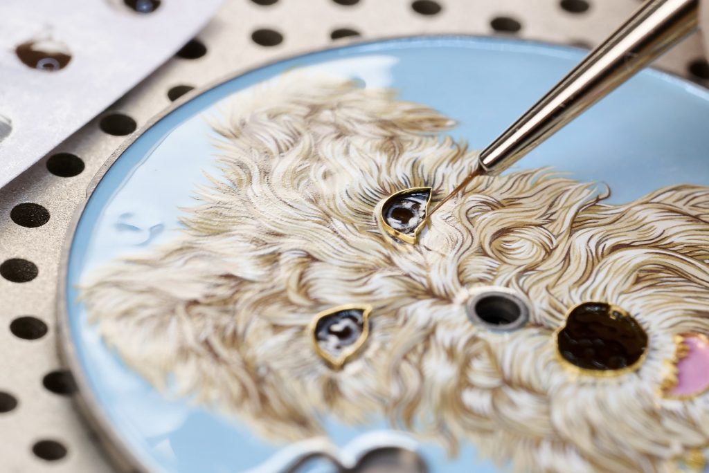 Taco, the ever-smiling mischief-maker, is realised through a harmonious blend of miniature painting and cloisonné enamelwork. A base of soft blue enamel sets the scene, upon which delicate strokes create his fluffy white coat. Fine gold wires of varying thickness outline the curves of his fur and collar, forming miniature partitions that guide the coloured enamel. During firing, these gold cloisons fuse seamlessly with the surface, giving the dial a sculptural richness and captivating dimension.