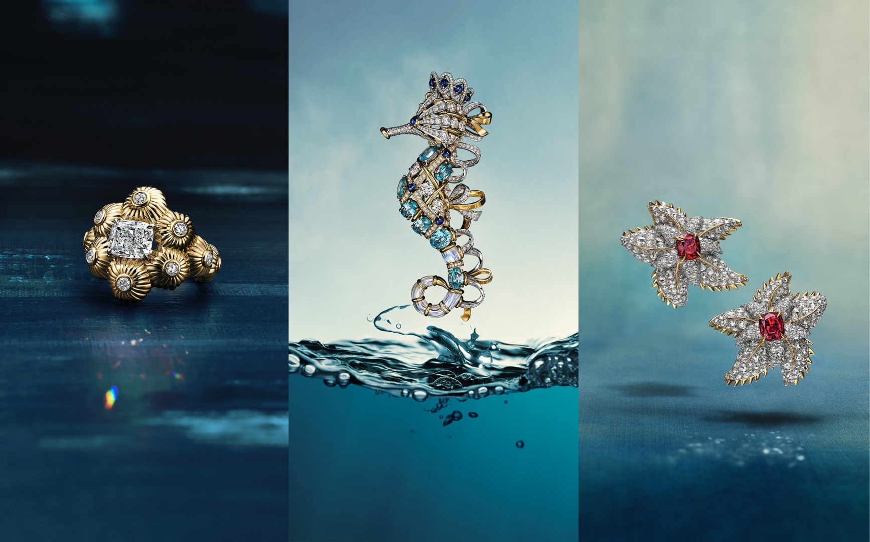 Urchin เม่นทะเล ที่โดดเด่นด้วยเทคนิคลงยา Paillonné ฟื้นคืนศิลปะจากศตวรรษที่ 19 ให้สัมผัสแบบสามมิติที่โดดเด่น และท้ายสุดกับ Wave หรือเกลียวคลื่นมหาสมุทรด้วยสร้อยคอประดับเพชรและทัวร์มาลีนหลากเฉดสี รังสรรค์แรงบันดาลใจจากผลงาน Leaves อันเลื่องชื่อของ Schlumberger
