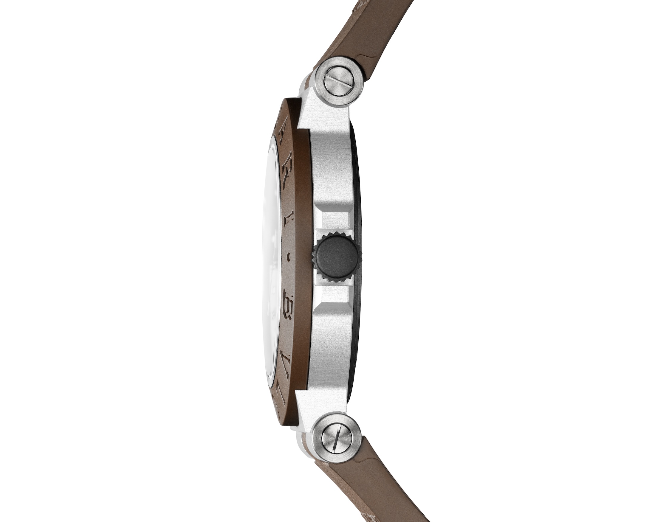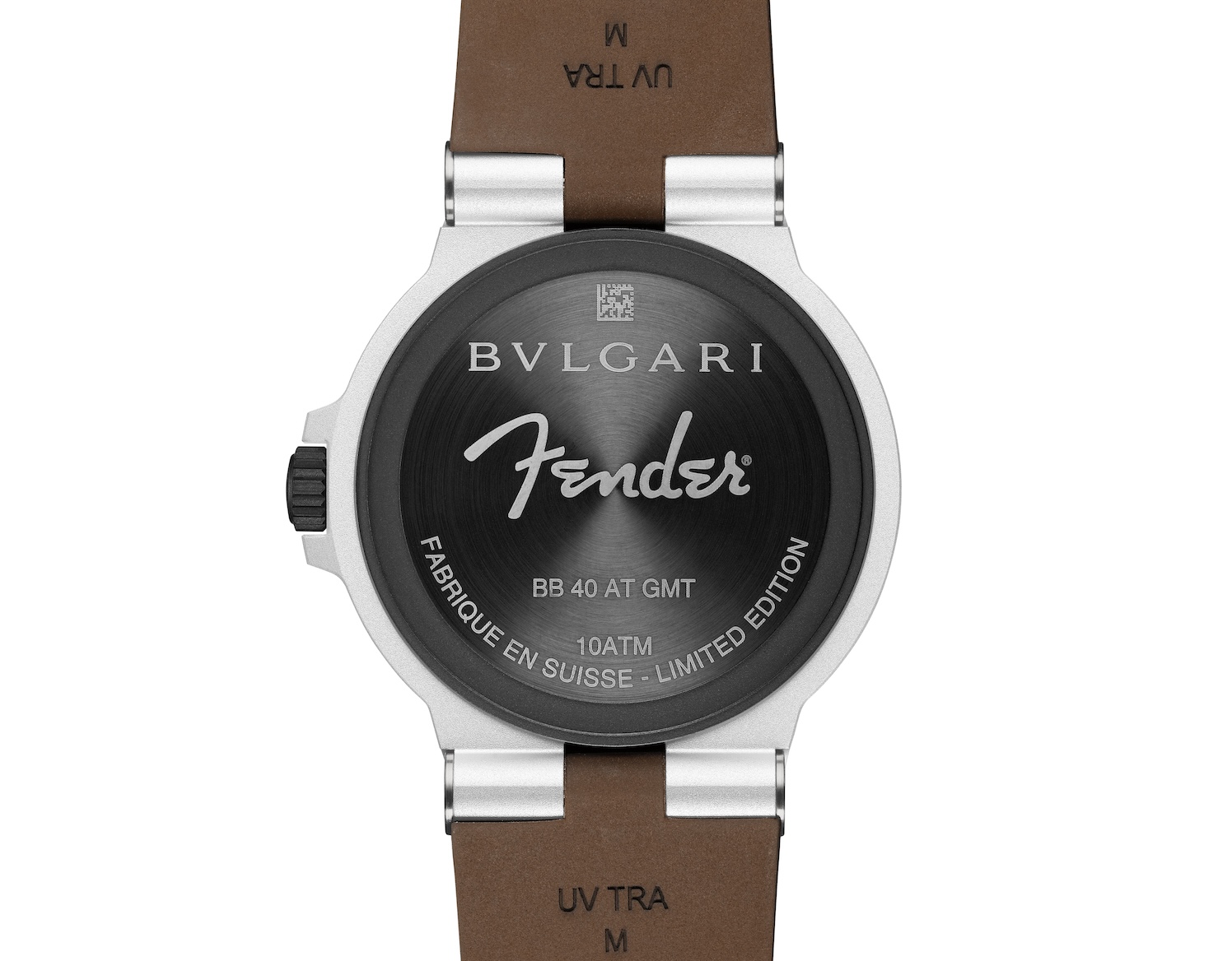Bulgari Aluminium GMT x Fender Limited Edition ได้แรงบันดาลใจมาจากลวดลายซันเบิร์สอันงดงามของ Fender Stratocaster นำมาถ่ายทอดเป็นหน้าปัดสีน้ำตาลทองแวววาวไล่เฉดไปสู่ขอบสีน้ำตาลเข้มอันหรูหรา สเกล GMT สีครีมและน้ำตาลพร้อมตำแหน่งบอกชั่วโมง ได้รับการแกะสลักอย่างพิถีพิถันให้มีลักษณะคล้ายเฟร็ตหรือเหล็กหลังคอกีตาร์ สะท้อนความสัมพันธ์ระหว่างจังหวะการบอกเวลาและเสียงเพลง