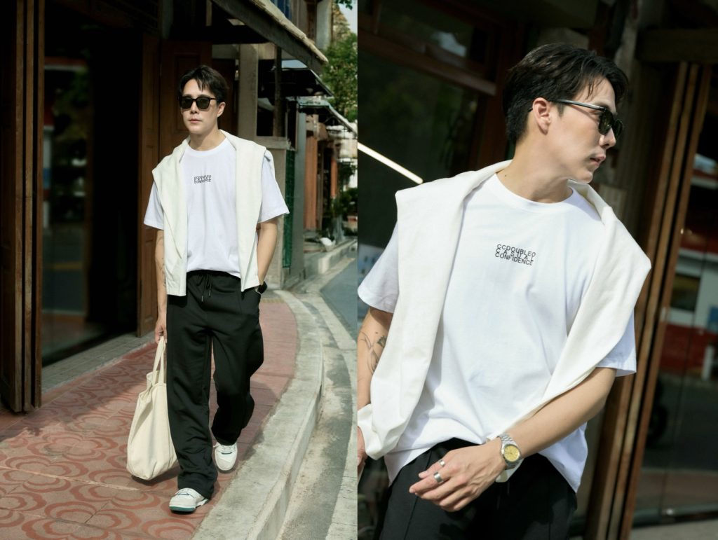 Meanwhile, Foei Patara Eksangkul embraces a bold, masculine edge in a black T-shirt with straight-cut denim, accentuated by a Western-inspired belt. The look balances sharp detail with relaxed ease, embodying the essence of casual confidence.
