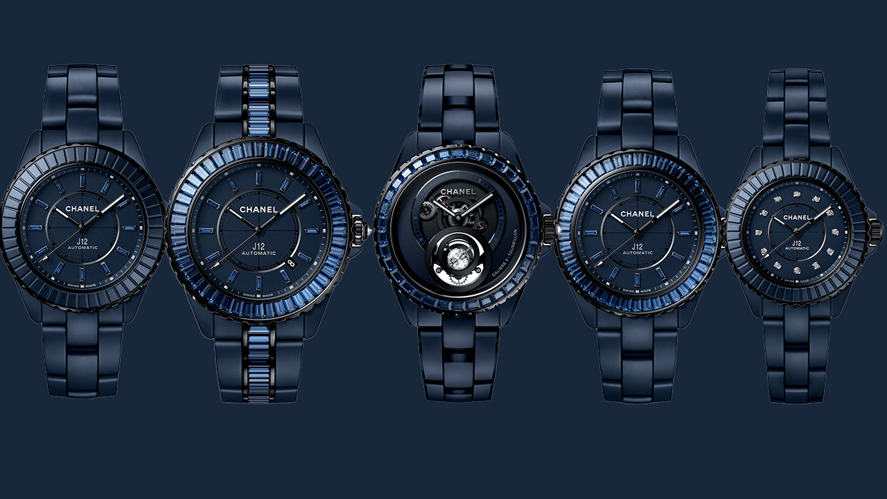 สตูดิโอสร้างสรรค์นาฬิกาของ CHANEL ได้รังสรรค์นาฬิกา J12 เรือนพิเศษขึ้นมาในสองขนาด คือตัวเรือนขนาด 42 มม. และอีกเรือนในขนาด 28 มม. นาฬิกาคู่ดูโอต่างไซส์นี้ประดับด้วยแซปไฟร์สีน้ำเงินที่เปล่งประกายไปทั่วขอบตัวเรือน หน้าปัด และสายนาฬิกา ความระยิบระยับนี้ตัดกับตัวเรือนเเละสายเซรามิกสีน้ำเงินด้านของชาเนลได้อย่างโดดเด่น โดยต้องใช้เวลานานกว่า 110 ชั่วโมงในกระบวนการฝังอัญมณีภายในเวิร์คชอปของชาเนล ในรุ่น 42 มม. ใช้แซปไฟร์แบบเหลี่ยมเจียระไนจำนวน 170 เม็ด และรุ่น 28 มม. ใช้แซปไฟร์ทั้งหมด 196 เม็ด ขอบตัวเรือนและเม็ดมะยมที่ทำจากสตีลเคลือบสีดำขับเน้นเฉดสีและความลึกของเซรามิกสีน้ำเงินให้โดดเด่นยิ่งขึ้น
