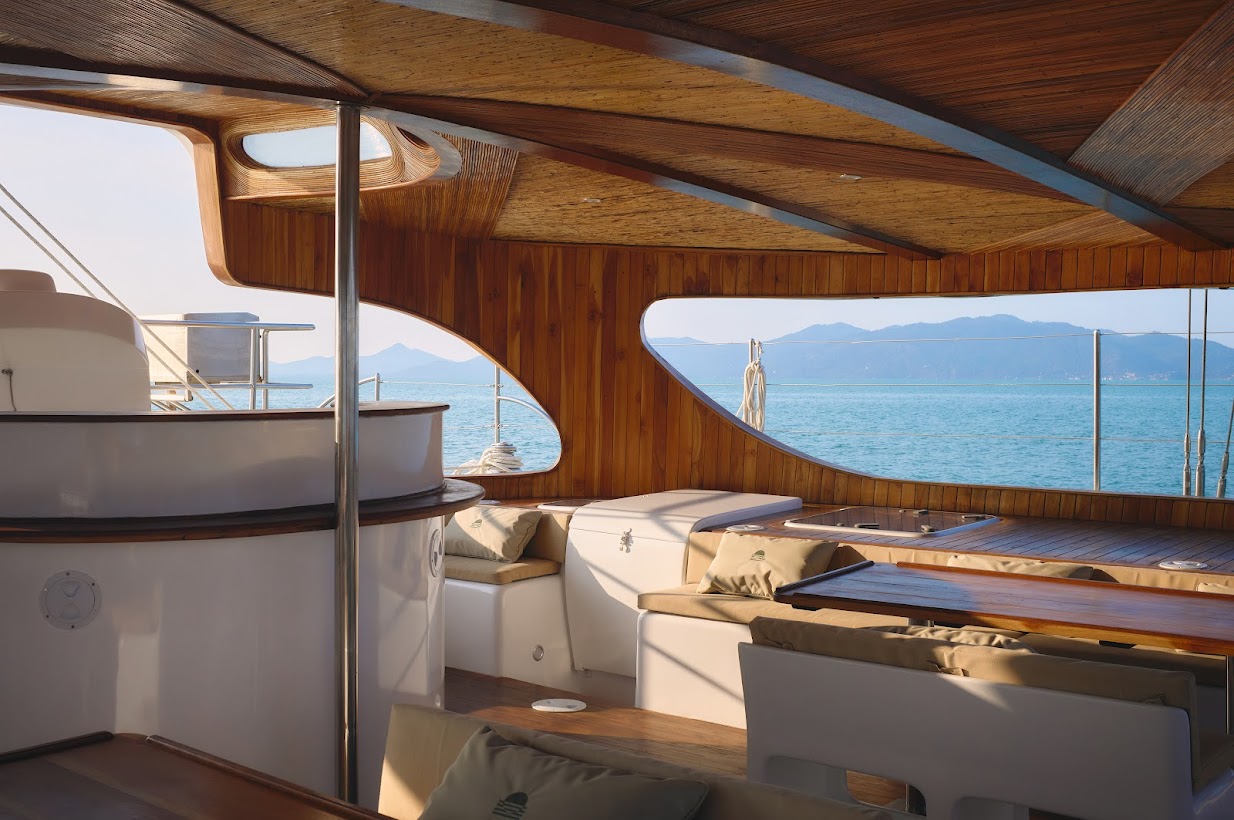 เรือคาตามารันลำนี้ได้รับการปรับปรุงภายในใหม่ทั้งหมด ด้วยการใช้ไม้สักและเส้นหวายที่ถูกคัดสรรมาอย่างประณีตและจัดเรียงเป็นลวดลายที่สวยงามเป็นเอกลักษณ์ ผ่านการทำงานกับช่างต่อเรือท้องถิ่นตามความมุ่งมั่นในการสนับสนุนชุมชนท้องถิ่น อนุรักษ์สิ่งแวดล้อม และส่งมอบประสบการณ์ที่มีคุณค่า