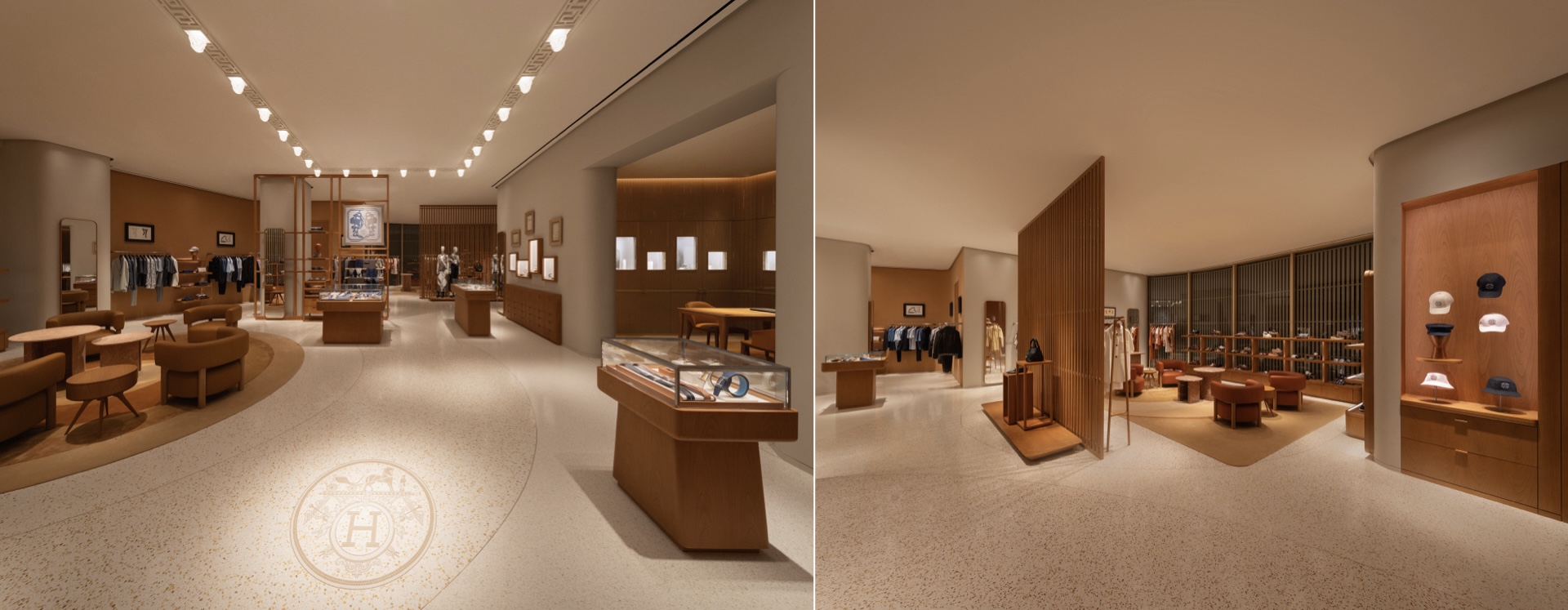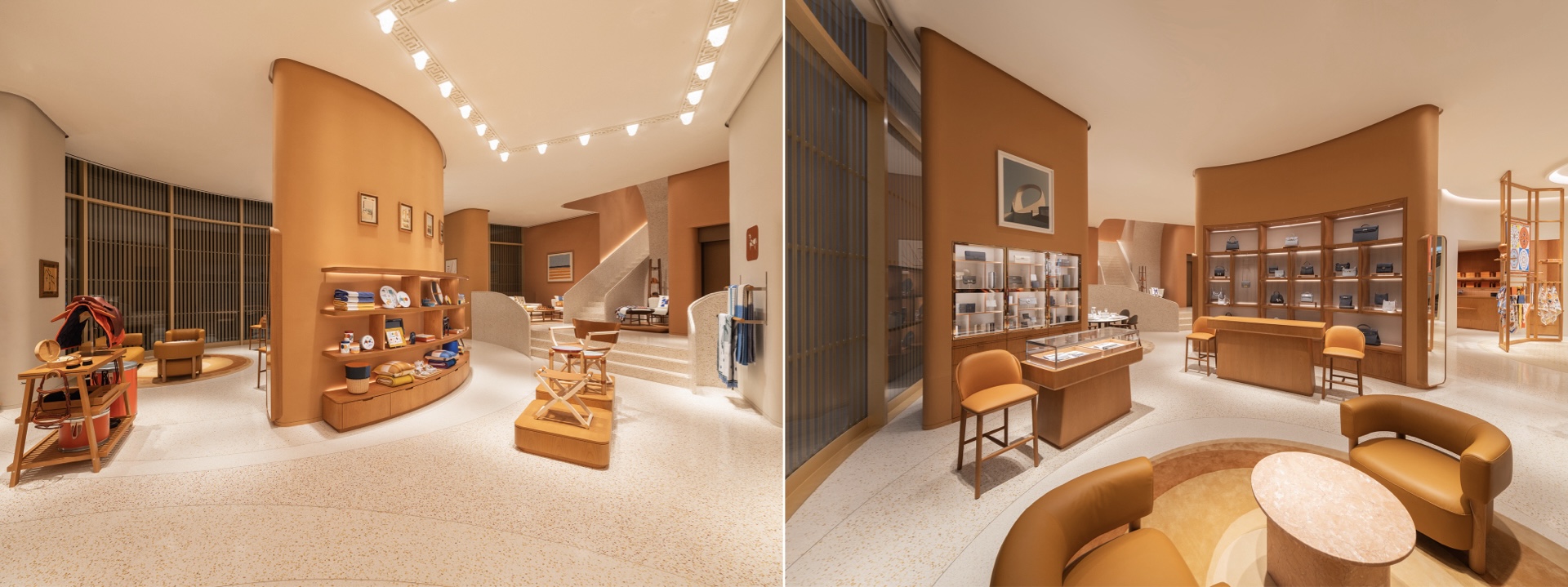 ซึ่งการจัดวางพื้นที่และการออกแบบตกแต่งภายในของบูติคแห่งนี้ได้รับการกำกับดูแลโดย RDAI ที่ซึ่งเป็นบริษัทออกแบบชั้นนำจากกรุงปารีส ประเทศฝรั่งเศส ที่เลือกใช้ม่านไม้ สีสันที่เปล่งประกาย และพรมที่ถักทอด้วยฝีมือของช่างท้องถิ่น พร้อมไปกับการตกแต่งพื้นที่ด้วย ผลงานศิลปะจากคอลเลกชันของ Émile Hermès ถูกนำมาตกแต่งภายในร้านอย่างประณีต เช่น รูปปั้นม้า 3 มิติจากโครงลวดฝีมือ Marie Christophe ประติมากรชาวฝรั่งเศสที่แขวนอยู่บริเวณบันได หรือภาพเรขาคณิตแอ็บสแตร็กต์ของ Cécile Baillot-Jourdan และภาพถ่ายนักเต้นขาวดำของ Tadzio เพื่อนำเสนอบรรยากาศผ่อนคลาย เรียบง่าย และน่าหลงใหลในมิติที่ดีที่สุดตามแบบฉบับของแบรนด์