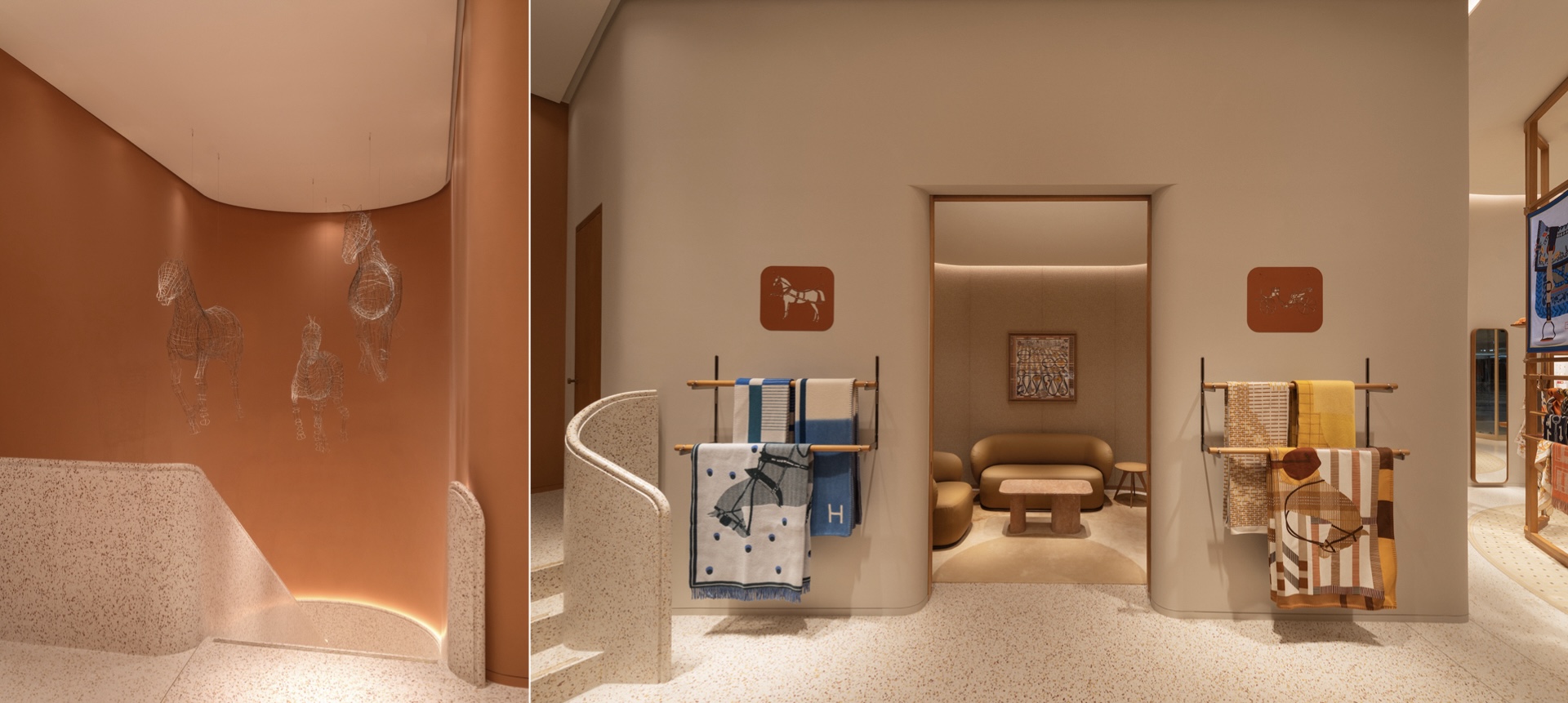 นอกจากนี้ การแบ่งโซนต่างๆ ภายในบูติคใหม่แห่งนี้ยังได้มีการจัดวางอย่างน่าสนใจ เพื่อเน้นให้เห็นถึงผลิตภัณฑ์จาก 16 métier ของ Hermès ไม่ว่าจะเป็นโซนผลิตภัณฑ์สายความงามและน้ำหอม โซนผ้าพันคอของสุภาพสตรีที่จัดวางอยู่ตรงกลางร้าน โซนแฟชั่นจิวเวลรี่ทางด้านขวามือ ไปจนถึงคอลเลคชั่นสำหรับการกีฬาขี่ม้าและของใช้ภายในบ้านทางด้านซ้ายที่เชื่อมต่อกับโซนเครื่องหนัง