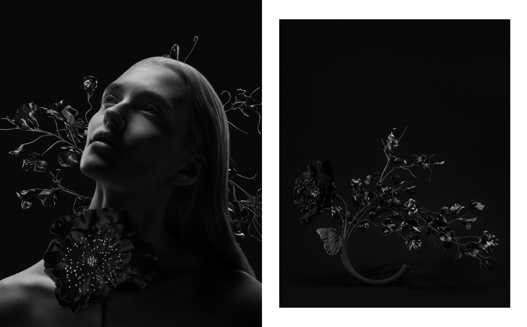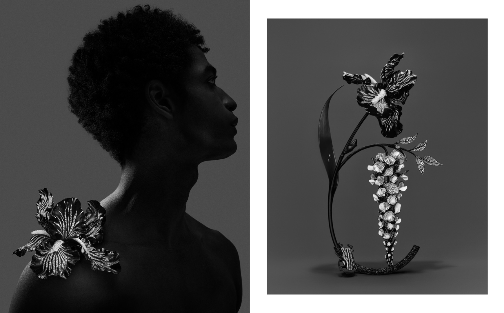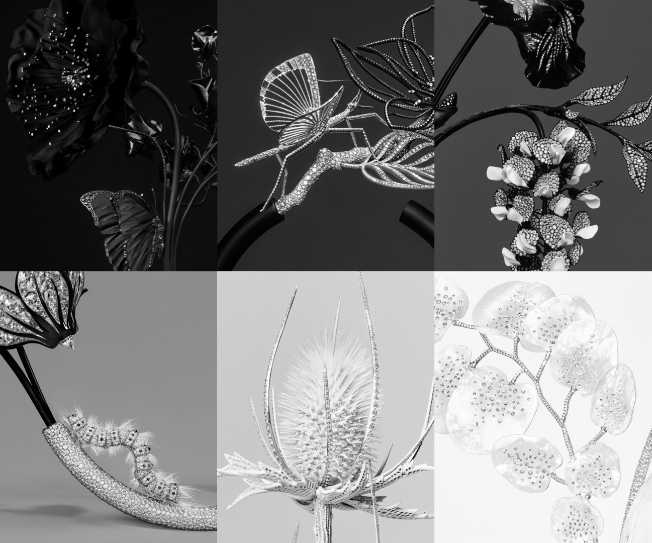 Composition N°3: Irises, wisteria, and a stag beetle in a dramatic black-and-white palette convey a sense of vulnerability through ceramics, aluminium, and sparkling diamonds.