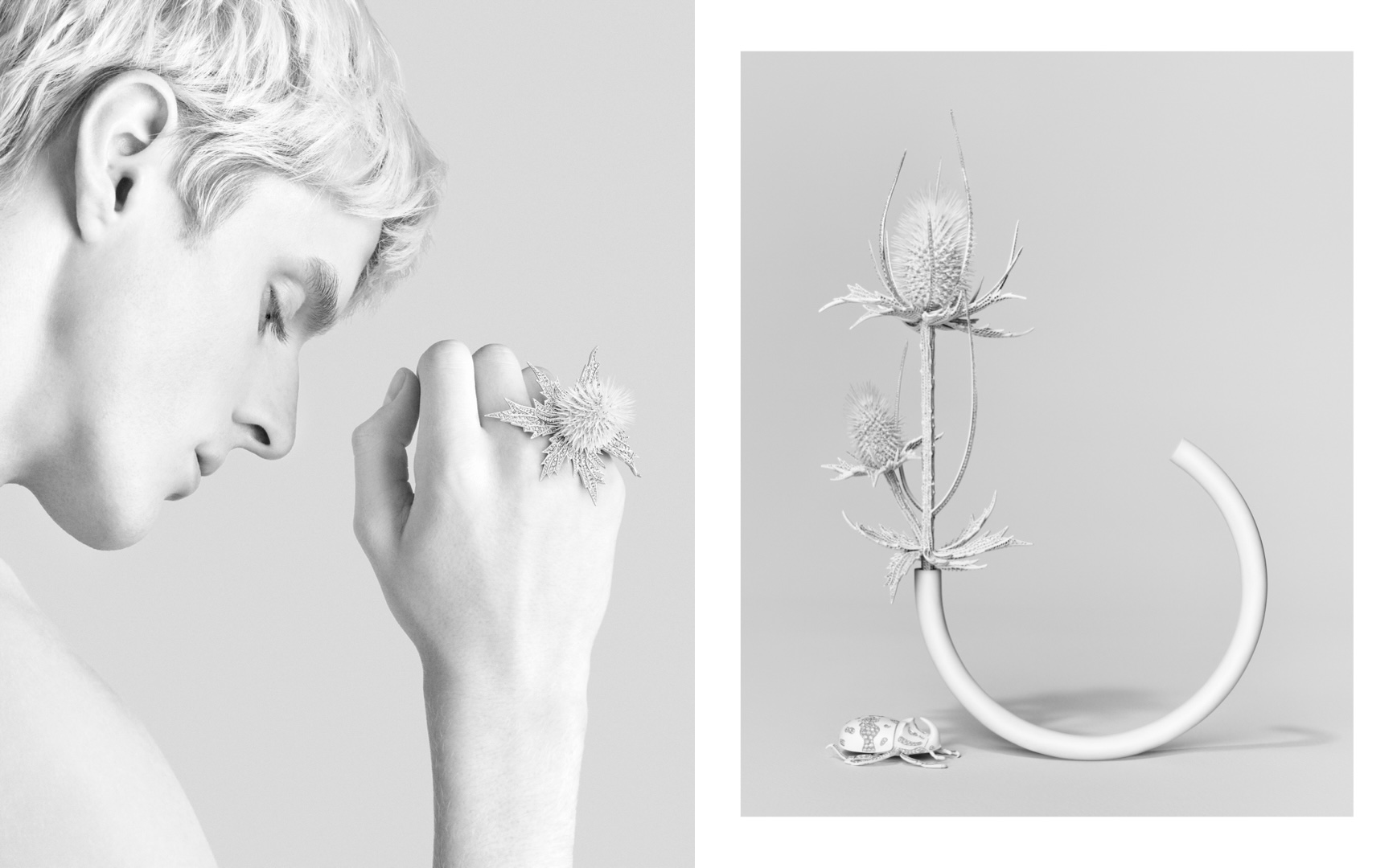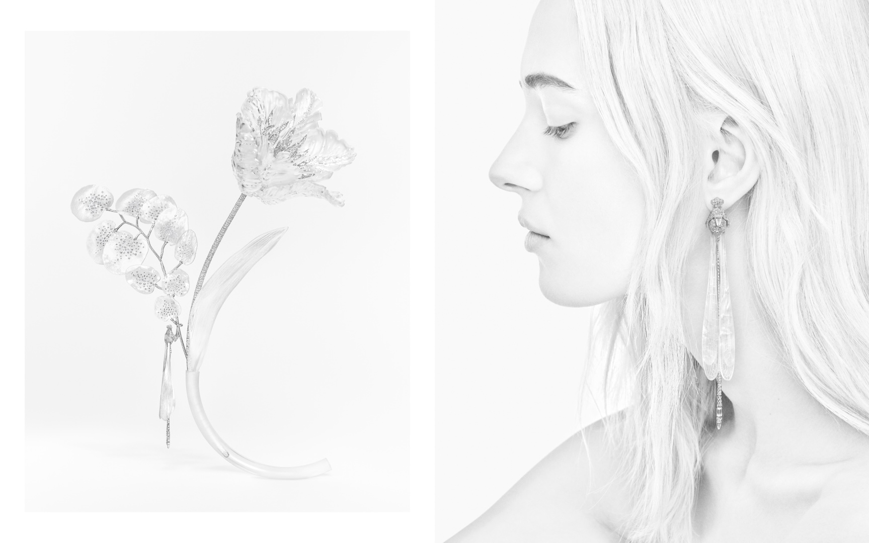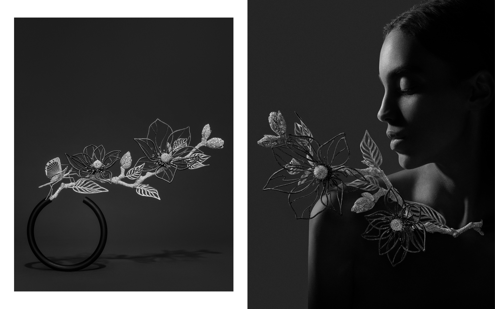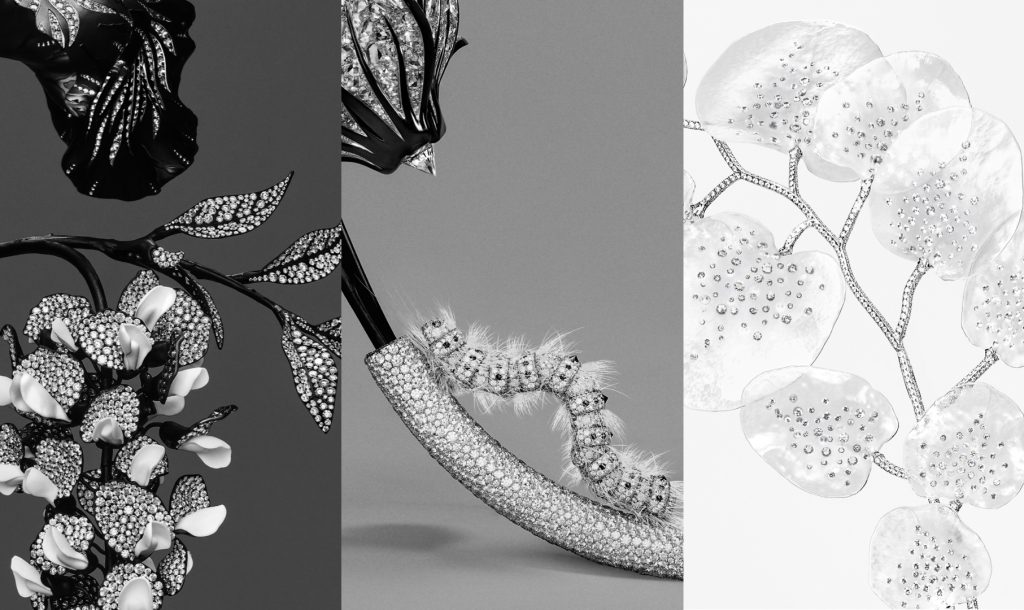 Composition N°3: Irises, wisteria, and a stag beetle in a dramatic black-and-white palette convey a sense of vulnerability through ceramics, aluminium, and sparkling diamonds.