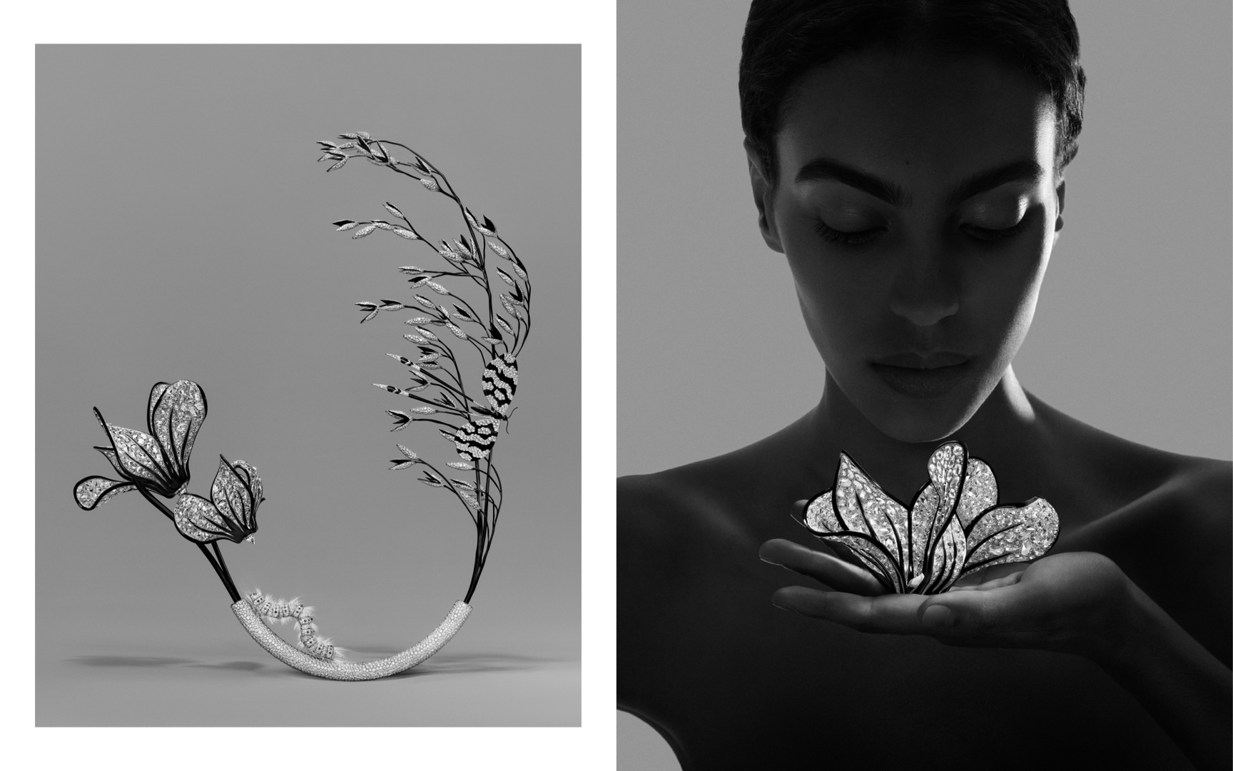 The collection is the vision of Claire Choisne, Boucheron’s Creative Director, who drew inspiration from the Japanese philosophies of Wabi-Sabi and Ikebana. Comprising over 28 unique pieces across six key compositions, the collection reflects transitional moments in nature, between light and shadow, material and spirit, form and transformation.