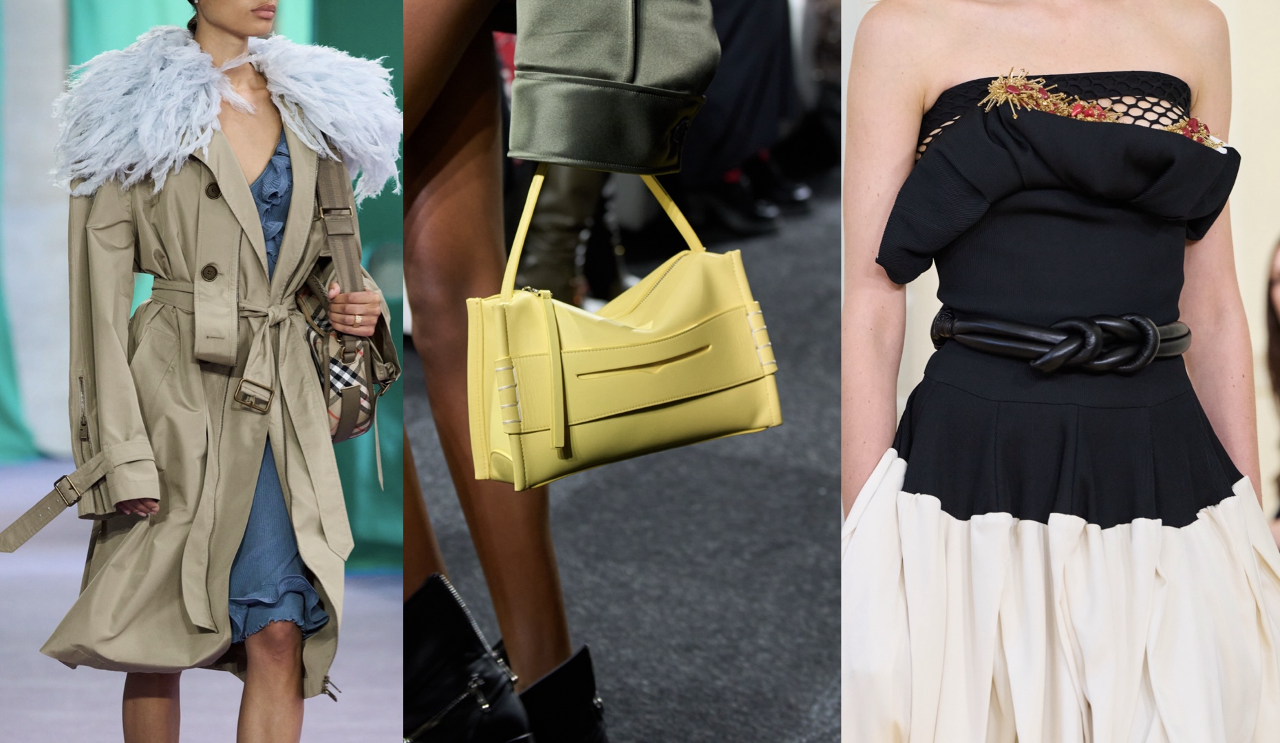 อีกในแบรนด์หลักประจำ London Fashion Week ที่จะไม่พูดถึงไม่ได้เลยสำหรับ Burberry ที่ในคอลเลคชั่นนี้ได้รับความร่วมมือจากศิลปินชาวอังกฤษผู้มากชื่ออย่าง Gary Hume มาช่วยเนรมิตพื้นที่ National Theatre ให้เทิร์นไปสู่พื้นที่สำหรับรันเวย์ในครั้งนี้ โดย Daniel Lee ผู้ดำรงตำแหน่งหัวเรือของแบรนด์ได้เลือกที่จะตีความเรื่องราวความอบอุ่นสไตล์ซัมเมอร์ในรูปแบบที่ต่างออกไป พร้อมนำเสนอลักษณะของเสื้อผ้าที่สวมใส่ได้จริงกว่าที่เคยเป็นมาในทุกคนได้สัมผัส โดยแพทเทิร์นสุดซิกเนเจอร์ของแบรนด์อย่าง Burberry Check ยังคงมีปรากฏให้เห็นแม้จะในมุมมองที่ต่างออกไป แต่สิ่งที่ดึงดูดสายตาได้อย่างแท้จริงประจำโชว์นี้ที่นอกเหนือไปจากโครงสร้างเสื้อผ้าที่งดงาม มีชั้นเชิงแล้ว ความโดดเด่นของวัสดุแวววาวอย่างเมทัลลิคในเฉดสีที่หลากหลายยังคงเป็นองค์ประกอบที่สร้างความประทับใจได้เสมอ