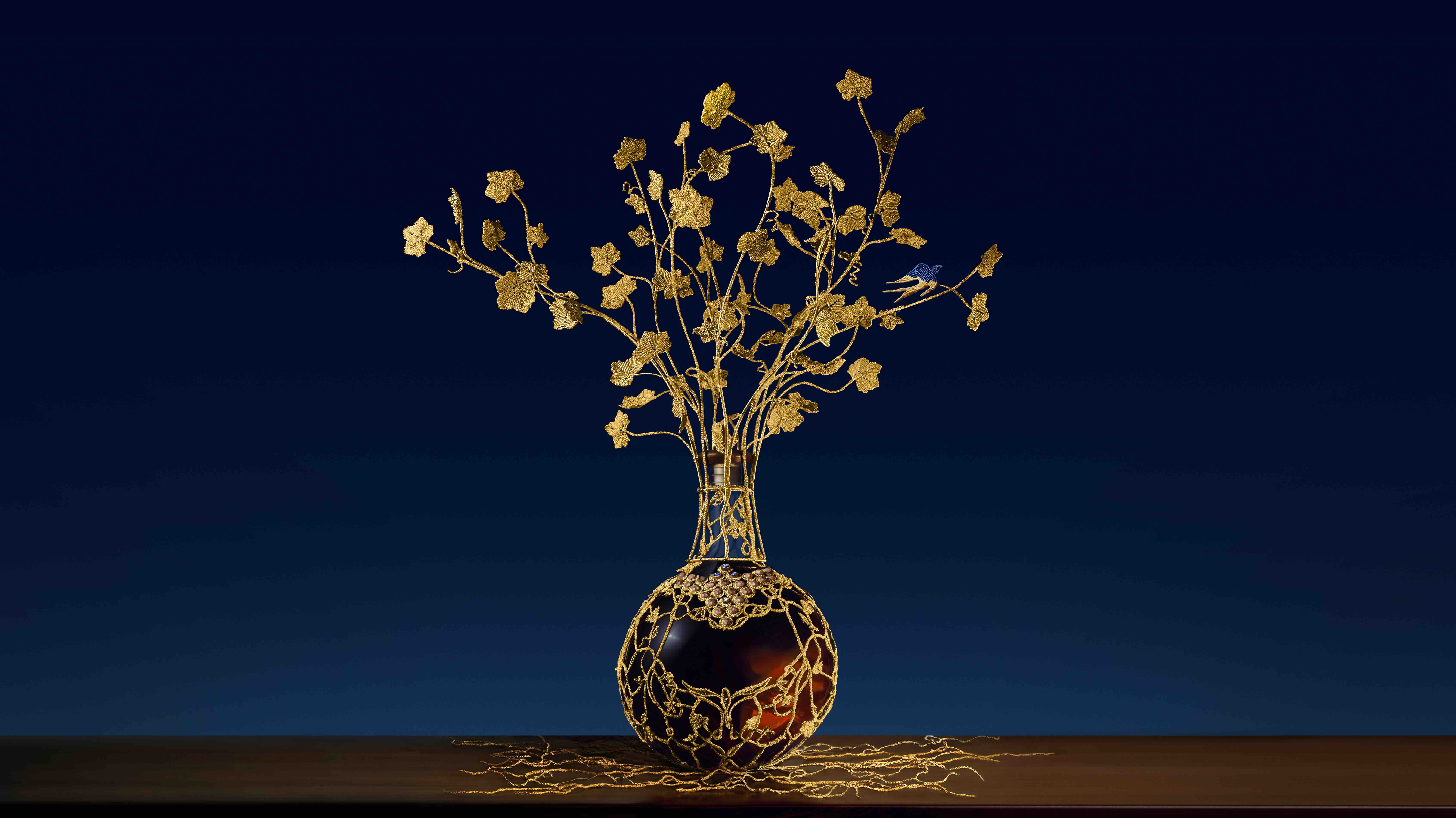 โดยในครั้งนี้ Laurentine ได้นำเอาด้ายทองคำาแท้จากโรงงานในเมือง Lyon ประเทศฝรั่งเศส มาถักทอเป็นลวดลายของเถาวัลย์สุดซับซ้อน พร้อมประดับด้วยไพลินสังเคราะห์จำนวน 3 เม็ดที่สะท้อนถึงสีน้ำเงินอันโดดเด่นของแบรนด์ Martell และเพชรอีก 1 เม็ด บนฐานทองคำ 22 กะรัต รวมไปถึงการตกแต่งด้วยไม้โอ๊คที่มีอายุกว่า 300 ปี ที่ถูกนำมาแกะสลักเป็นรูปทรงอัญมณี ที่ทั้งหมดใช้เวลาในการรังสรรค์กว่า 800 ชั่วโมง