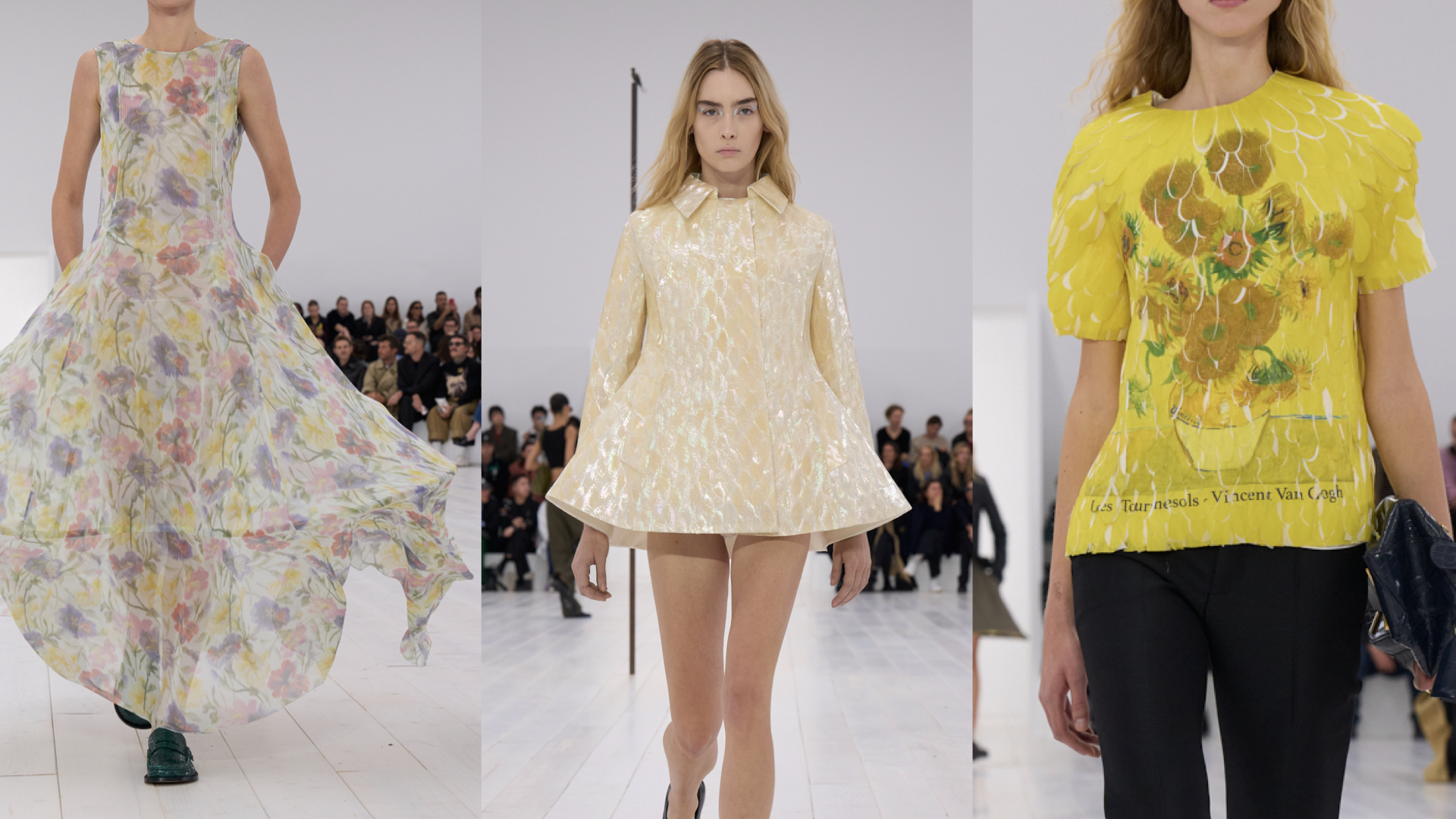 โดยโชว์ดังกล่าวมาพร้อมหนึ่งไฮไลท์กับชุดเดรสสั้นที่ทำจากวัสดุเปลือกไข่มุก ที่ถูกนำมาตัดและเรียงด้วยมืออย่างพิถีพิถัน โดยปราศจากการใช้เครื่องจักรต่าง ๆ รังสรรค์ออกมาเป็นชุดที่ดูงดงามเสมือนเกล็ดปลาที่เล่นกับแสงดังที่เราได้เห็นกันบนรันเวย์