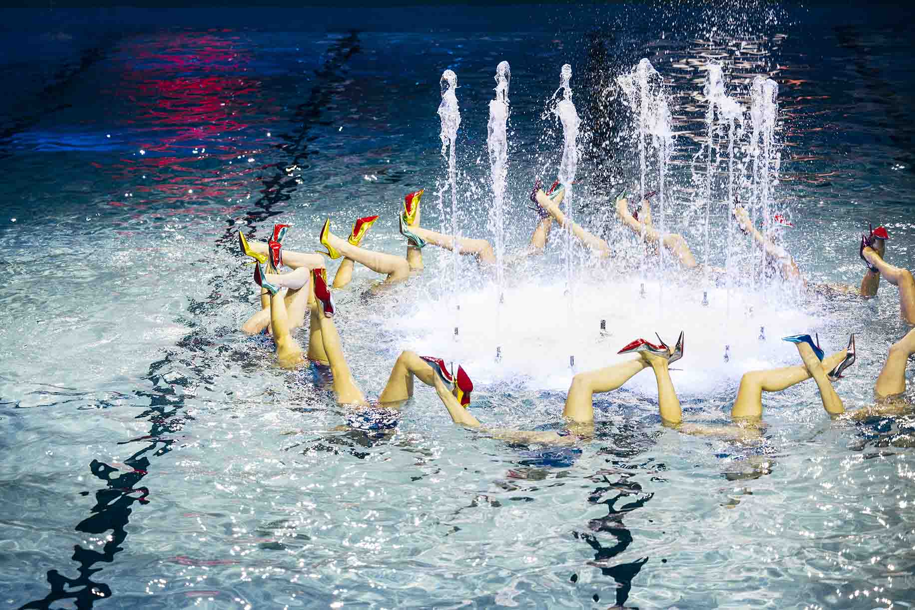 ภาพวีดีโอโมชั่นจากโปรเจคเตอร์ของ LaChapelle ฉายลงบนอาคารและสระว่ายน้ำทำให้บริเวณโดยรอบนั้นสว่างไสวไปด้วยแสงสี ตัวอาคารของอนุสรณ์สถานแห่งนี้เปลี่ยนเป็นฉากหลังอันน่ามหัศจรรย์ เสริมด้วยน้ำพุกลางสระที่ลดหลั่นกันเป็นชั้นตามจังหวะราวกับการร่ายรำ และประติมากรรมรองเท้าส้นสูงขนาดใหญ่ซึ่งทำหน้าที่เป็นสไลเดอร์ลงในสระน้ำอีกด้วย การแสดงเปิดฉากอย่างยิ่งใหญ่เมื่อนักว่ายน้ำจากทีมระบำใต้น้ำโอลิมปิกทีมชาติฝรั่งเศสเดินเรียงแถวกันมาในรองเท้าส้นสูงพวกเธอก้าวลงสู่สระน้ำอย่างสง่างามในรองเท้าส้นสูงรุ่น Miss Z โทนสีเมทัลลิกอันงดงามของ Louboutin นำเสนองานดีไซน์ใหม่ผ่านการร่ายรำใต้นำที่ประสานกันอย่างลงตัวกับเสียงร้องสดโดยนักแต่งเพลงและนักร้องชื่อดัง LP.