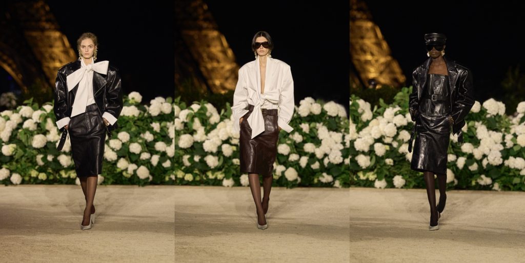 Vaccarello’s narrative unfolded in three deliberate chapters. He began with black leather as armor, broad-shouldered biker jackets, pencil skirts, and crisp white pussy-bow blouses inflated almost to rebellion. Some looks were topped with military caps in glossy black leather, evoking both Helmut Newton’s stark photography and Robert Mapplethorpe’s erotic iconography. “I wanted to start with the idea of cruising in the gay scene of the Tuileries,” he explained, “and redo it here, in front of the Trocadéro, with women in leather circling a massive YSL.” It was an opening of provocation and power, establishing sexual charge as a root code of the house.