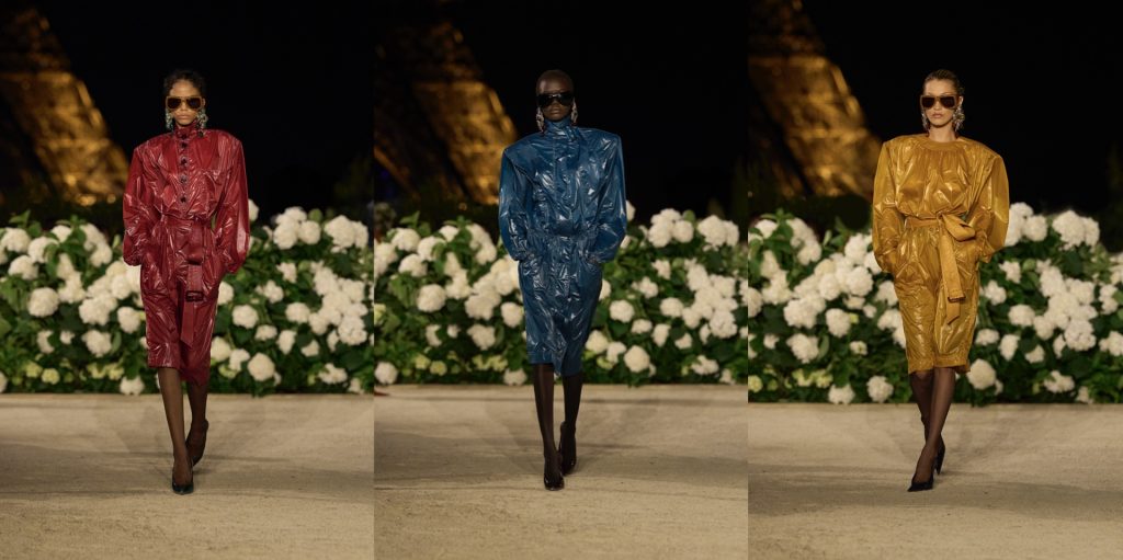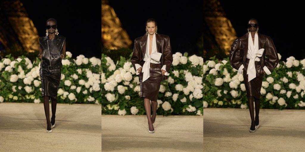 Vaccarello’s narrative unfolded in three deliberate chapters. He began with black leather as armor, broad-shouldered biker jackets, pencil skirts, and crisp white pussy-bow blouses inflated almost to rebellion. Some looks were topped with military caps in glossy black leather, evoking both Helmut Newton’s stark photography and Robert Mapplethorpe’s erotic iconography. “I wanted to start with the idea of cruising in the gay scene of the Tuileries,” he explained, “and redo it here, in front of the Trocadéro, with women in leather circling a massive YSL.” It was an opening of provocation and power, establishing sexual charge as a root code of the house.