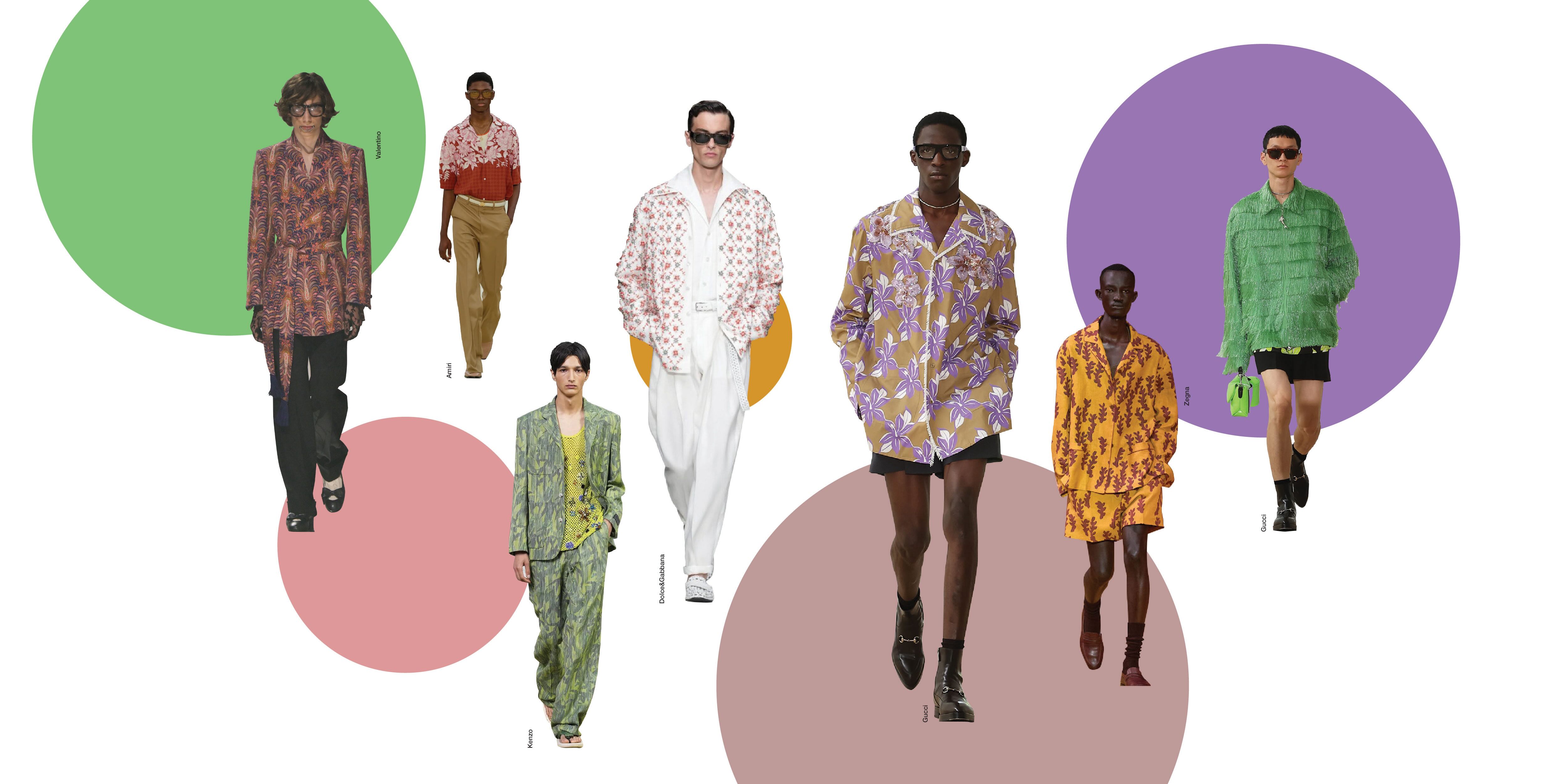Botanical Rhapsody: ลายดอกในแฟชั่นสุภาพบุรุษประจำฤดูกาลนี้ดูโดดเด่นกว่าที่เคย ผ่านหลากหลายลายพิมพ์ดอกไม้ขนาดใหญ่ที่ประดับบนเสื้อผ้าซฺลูเอทโปร่งสบาย ลวดลายดอกในฤดูกาลนี้ท้าทายขนบเดิม ปรากฏในขนาดที่ไม่คาดคิดและการผสมผสานสีสันที่สดใส กุญแจสำคัญในการจับเทรนด์นี้อยู่ที่การมิกซ์แอนด์แมตช์ลายพิมพ์และพื้นผิวที่แตกต่างกัน