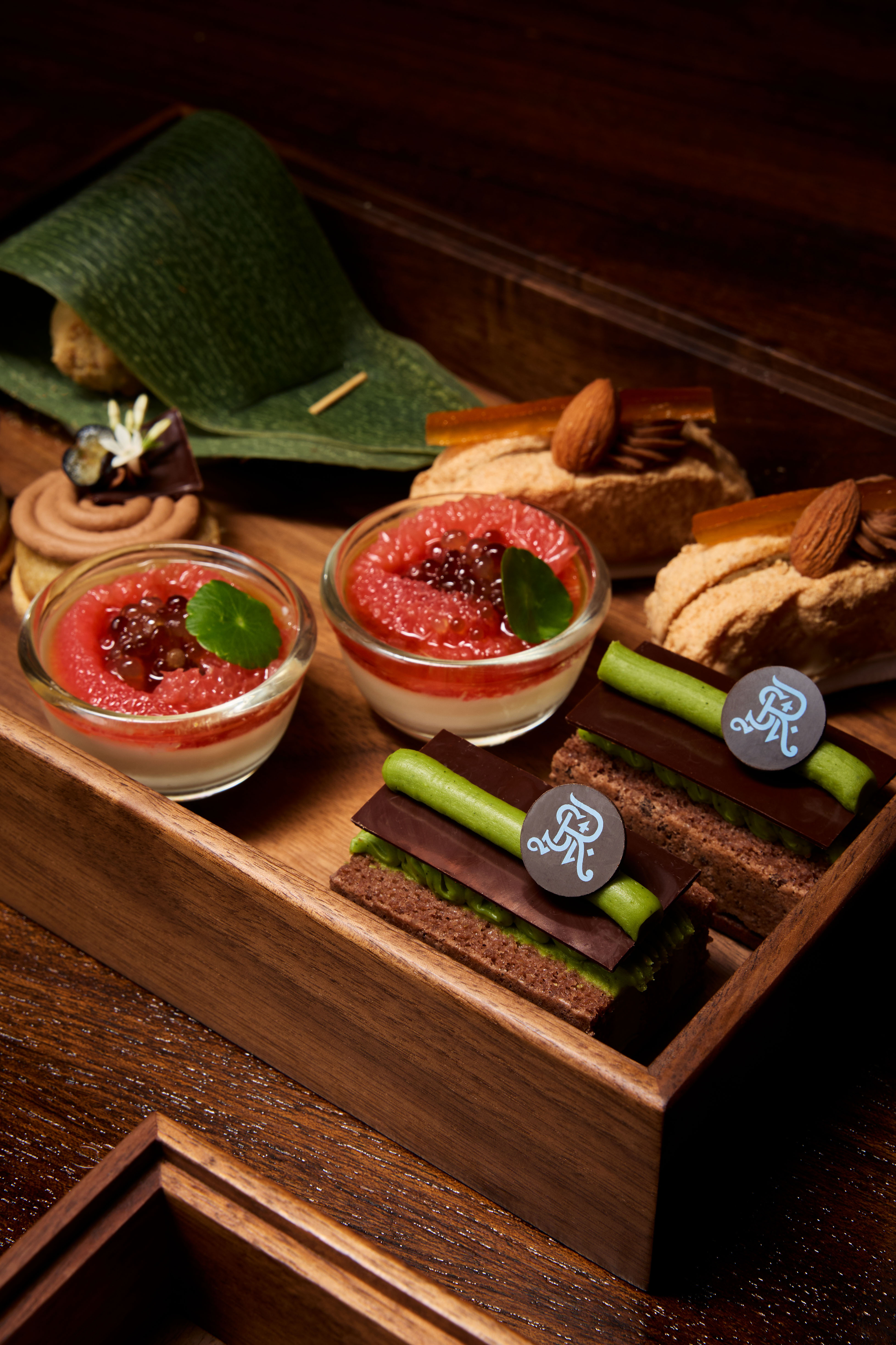 ปิดท้ายด้วยของหวานที่รังสรรค์ขึ้นโดยหัวหน้าเชฟขนมหวาน เชฟนันทิดา ปัญญาบารมี ผู้ผสมผสานความประณีตของขนมอบฝรั่งเศสให้เข้ากับสไตล์ตะวันออกอย่างลงตัว และเช่นเดียวกันกับของคาว ขนมหวานของชุดน้ำชายามบ่ายนี้ก็ถูกรังสรรค์ขึ้นมาจากวัตถุดิบของ Peace和Oriental Teahouse อาทิ ดักกัวซ์โฮจิฉะ ขนมอบสไตล์ฝรั่งเศสทำจากอัลมอนด์ไส้ครีมโฮจิฉะ ทานคู่กับส้มเชื่อมช่วยเสริมรสของชาให้โดดเด่นยิ่งขึ้น เค้กช็อกโกแลตเนื้อฟองน้ำ สอดไส้กานาชไวท์ช็อกโกแลตและมัทฉะเข้มข้นจาก Peace和 ต่อด้วยเมนูที่มีเนื้อสัมผัสเบาลงอย่าง พุดดิ้งนม ทานคู่ไข่มุกน้ำผึ้งป่าของ Peace和 ส่งตรงจากภาคเหนือของไทยเพื่อเพิ่มความสดชื่น และเกรปฟรุตที่มีรสชาติขมเล็กน้อยเพื่อล้างปาก นอกจากนี้ยังมีของหวานอื่น ๆ อาทิ เค้กเกาลัดสไตล์ฝรั่งเศสไส้แบล็คเคอแรนท์ ที่ความเปรี้ยวของแบล็คเคอแรนท์ตัดกับรสของเกาลัดได้เป็นอย่างดี ปิดท้ายของหวานด้วย ช็อกโกแลตสอดไส้มิโซะคาราเมล ผสมบรั่นดีลูกแพร์ เคลือบด้วยอัลมอนด์ โดยเชฟได้แรงบันดาลใจจาก Miso Caramel Coffee ที่ร้าน 手qraft. อีกหนึ่งแบรนด์ภายใต้ Peace和 Oriental Teahouse