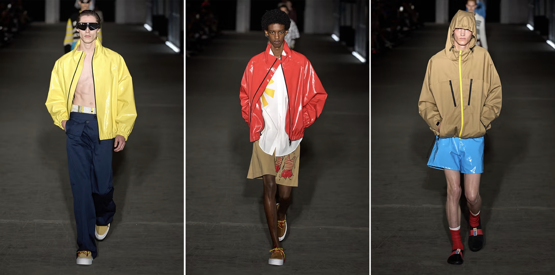 อีกหนึ่งยักษ์ใหญ่จากกรุงมิลาน ปราด้า (Prada) ภายใต้การกำกับดูแลของ Miuccia Prada และ Raf Simons นำเสนอความสดใสแปลกใหม่กลับมาสู่เมนส์แวร์กันอีกครั้ง Fondazione Prada สถาบันเพื่อศิลปะและวัฒนธรรมร่วมสมัยของ Miuccia Prada และ Patrizio Bertelli ได้ถูกปรับโฉมเป็นพื้นที่สำหรับรันเวย์ในครั้งนี้ ความน่าสนใจของคอลเลคชั่นนี้ไม่ได้อยู่ที่ดีไซน์ที่หวือหวาล้ำสมั้ย หากแต่เป็นการยกระดับรูปทรงและสัดส่วนของเสื้อผ้าทั่วไปที่ดูเรียบง่ายให้มีกิมมิคแปลกตา
