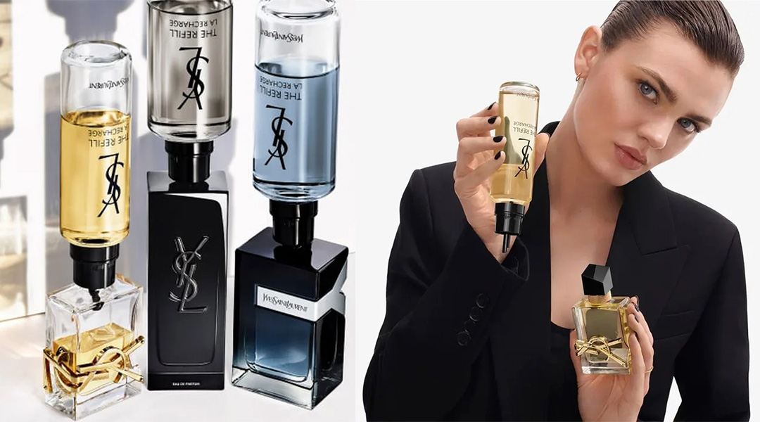 แบรนด์บิวตี้สัญชาติฝรั่งเศส YSL Beauty โดย แซงต์ โลรองต์ (Saint Laurent) นั้นมีความเชื่อว่าโลกที่เราอาศัยอยู่นั้นมีขอบเขตที่เราไม่ควรล้ำเส้น เพื่อคงไว้ซึ่งโลกที่เป็นบ้านที่ดีที่สุดของมวลมนุษย์ ทำให้แบรนด์มีความมุ่งมั่นที่จะเปลี่ยนแปลงวิธีการดำเนินธุรกิจเพื่อลดปัญหาด้านสิ่งแวดล้อมที่จะเกิดขึ้นและคาดหวังว่าจะทำได้ตามเป้าหมายดังกล่าวภายในปี 2030 ซึ่งหนึ่งในนั้นคือการเปิดตัวน้ำหอมแบบรีฟีล ที่สามารถใช้ภาชนะขวดซ้ำได้ ซึ่งการกระทำนี้สามารถช่วยลดขยะประเภทแก้วได้ถึง 41% ประเภทโลหะได้ถึง 67% และประเภทพลาสติกได้ถึง 37%