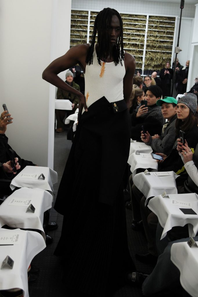 Creative partners Jale Richert and Michele Beil rounded out the season with an event doubling as a dinner party and fashion runway. Named “LANDEI”, meaning a person of naivety and unsophistication, this collection was a reclamation of the derogatory term. Coded by sleek gloss, androgynous silhouettes and delicate presence, the pair continued to push the definition of menswear. With a subtle achromatic palette, looks balanced the understated tension of black with the romantic poetic expression of deliberate proportionality and texture.