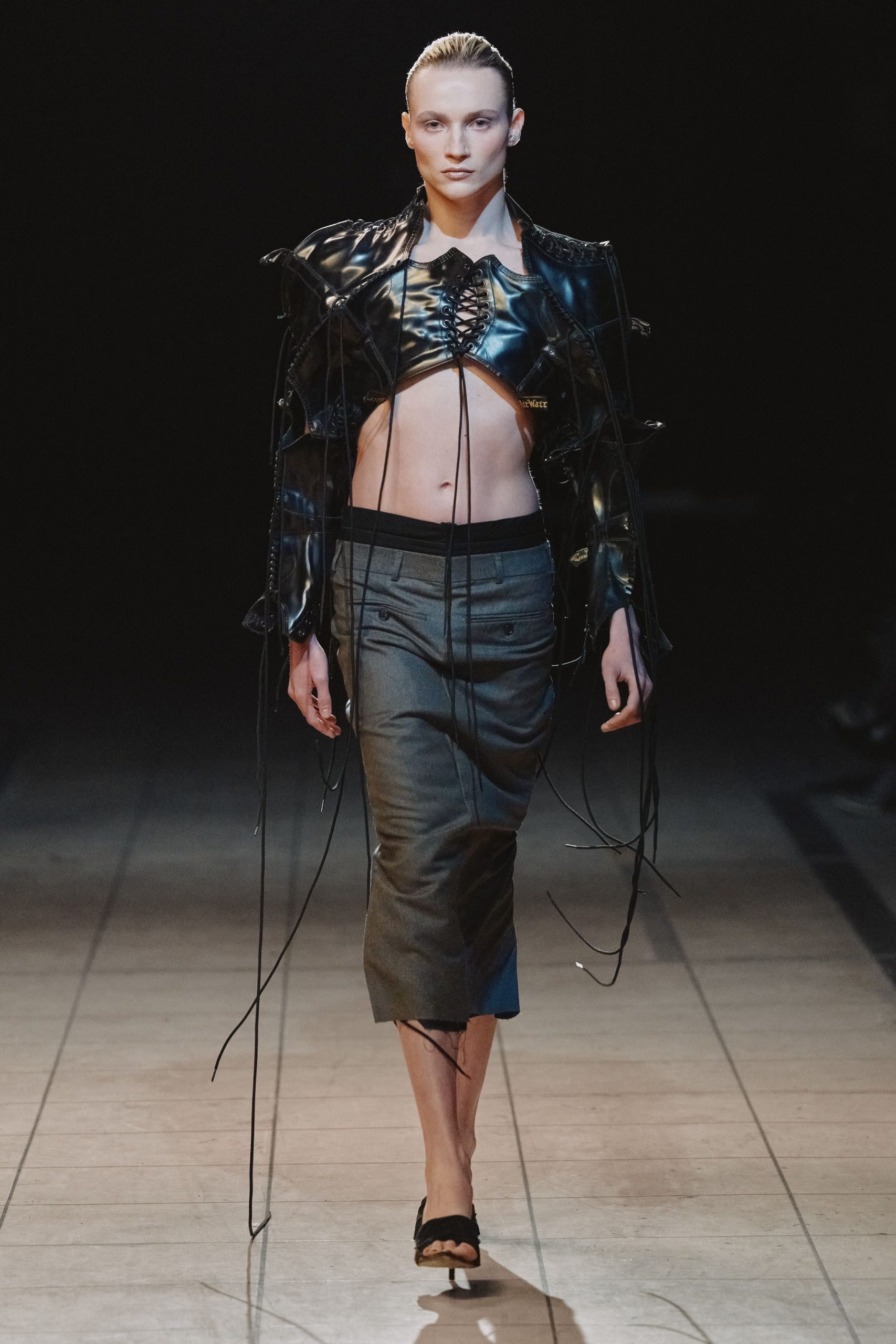 Known for unconventional draping and silhouettes that challenge traditional notions of aesthetic and beauty, Gerte’s “Deviant Defiant” saw her further experiment with the dynamic boundaries between sensuality and rebellion. Inspired by stereotypes of female villains as deviant, Gerte reimagines this perversion as empowerment. Radical tailoring and deliberate ornamentation wrap the body in an armour that is simultaneously revealing yet protective, contouring shapes into slim and voluminous exaggerations. Additionally partnering up with Dr. Martens, this collection combines upcycled and deadstock fabrics with deconstructed boots to sculpt a unique texture that both preserves the original identity of each garment while constructing a new, revolutionary function.