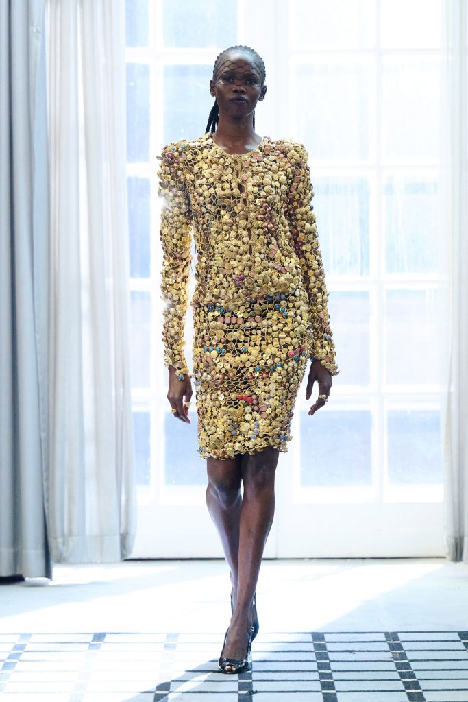 Continuing the theme of memorable settings, the French designer chose Rathaus Schöneberg – Berlin’s city hall – as the location for her show. With her drawing board starting from a box of buttons she bought in the 90’s, each piece features one such button sewn on as both eccentric ornamentation and individual statement. Weaving together vintage lingerie, De Betoly’s collection is characterised by reinvigoration and reimagination, transforming flea market finds into unique fashion statements. Highlights include a two-piece set crocheted with 7727 golden buttons and a dress constructed entirely of gilded jewellery.